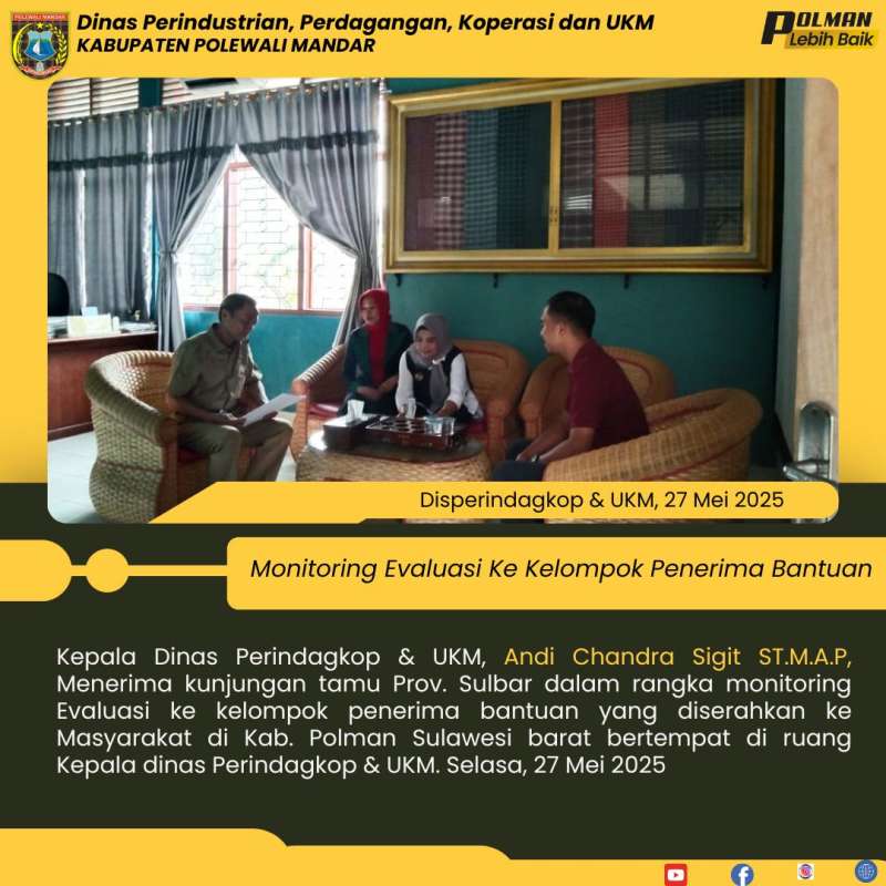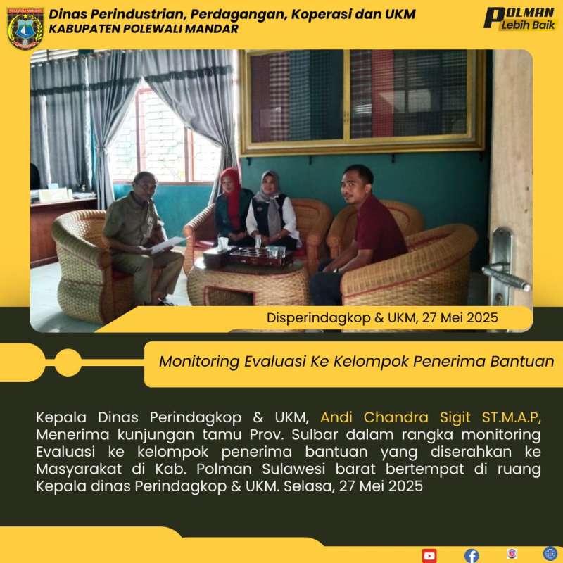 Kepala Dinas Perindagkop & UKM, Andi Chandra Sigit ST.M.A.P, Menerima kunjungan tamu Prov. Sulbar dalam rangka monitoring Evaluasi ke kelompok penerima bantuan yang diserahkan ke Masyarakat di Kab. Polman Sulawesi barat bertempat di ruang Kepala dinas Perindagkop & UKM. Selasa, 27 Mei 2025