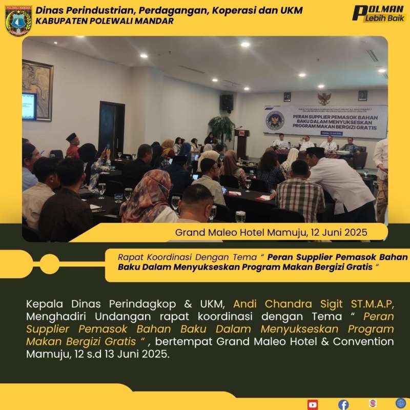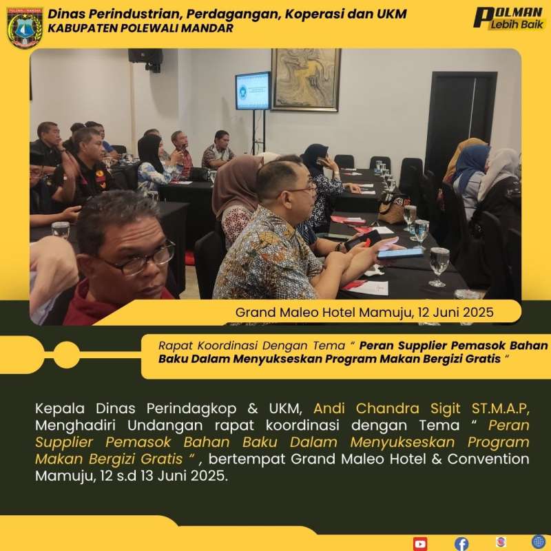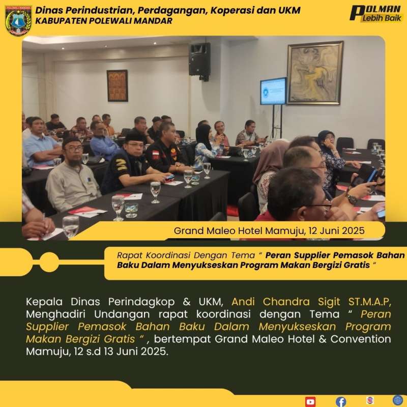 Kepala Dinas Perindagkop & UKM, Andi Chandra Sigit ST.M.A.P, Menghadiri Undangan rapat koordinasi dengan Tema “ Peran Supplier Pemasok Bahan Baku Dalam Menyukseskan Program Makan Bergizi Gratis “ , bertempat Grand Maleo Hotel & Convention Mamuju, 12 s.d 13 Juni 2025.