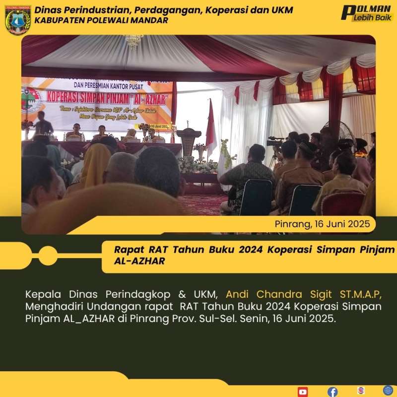 Kepala Dinas Perindagkop & UKM, Andi Chandra Sigit ST.M.A.P, Menghadiri Undangan rapat RAT Tahun Buku 2024 Koperasi Simpan Pinjam AL_AZHAR di Pinrang Prov. Sul-Sel. Senin, 16 Juni 2025.