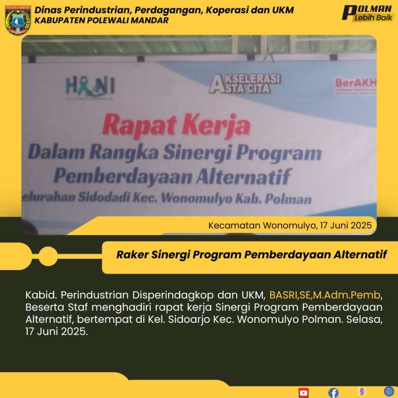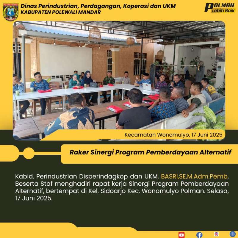 Kabid. Perindustrian Disperindagkop dan UKM, BASRI,SE,M.Adm.Pemb, Beserta Staf menghadiri rapat kerja Sinergi Program Pemberdayaan Alternatif, bertempat di Kel. Sidoarjo Kec. Wonomulyo Polman. Selasa, 17 Juni 2025.