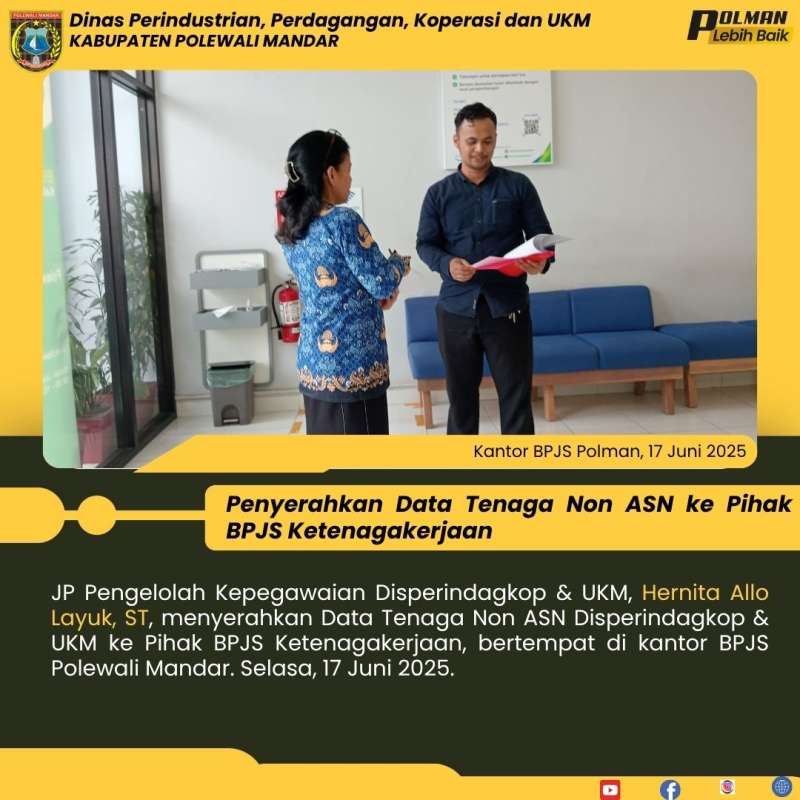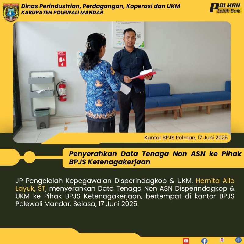 JP Pengelolah Kepegawaian Disperindagkop & UKM, Hernita Allo Layuk, ST, menyerahkan Data Tenaga Non ASN Disperindagkop & UKM ke Pihak BPJS Ketenagakerjaan, bertempat di kantor BPJS Polewali Mandar. Selasa, 17 Juni 2025.
