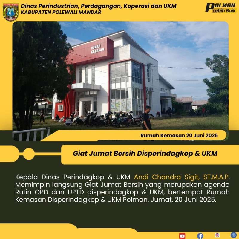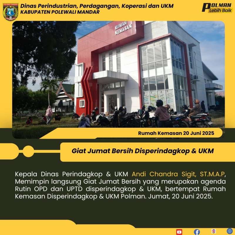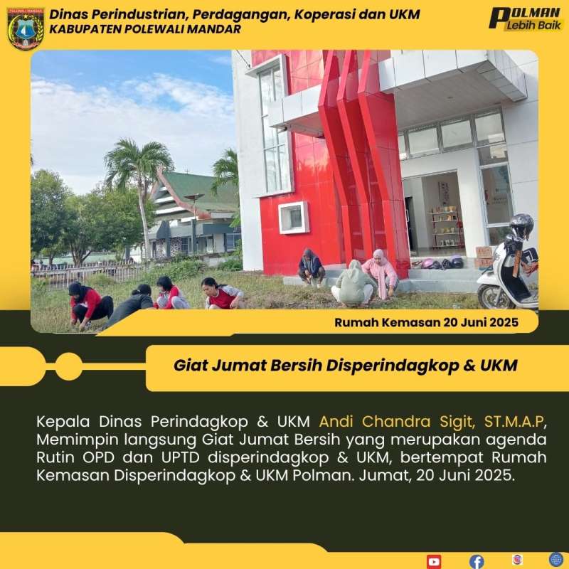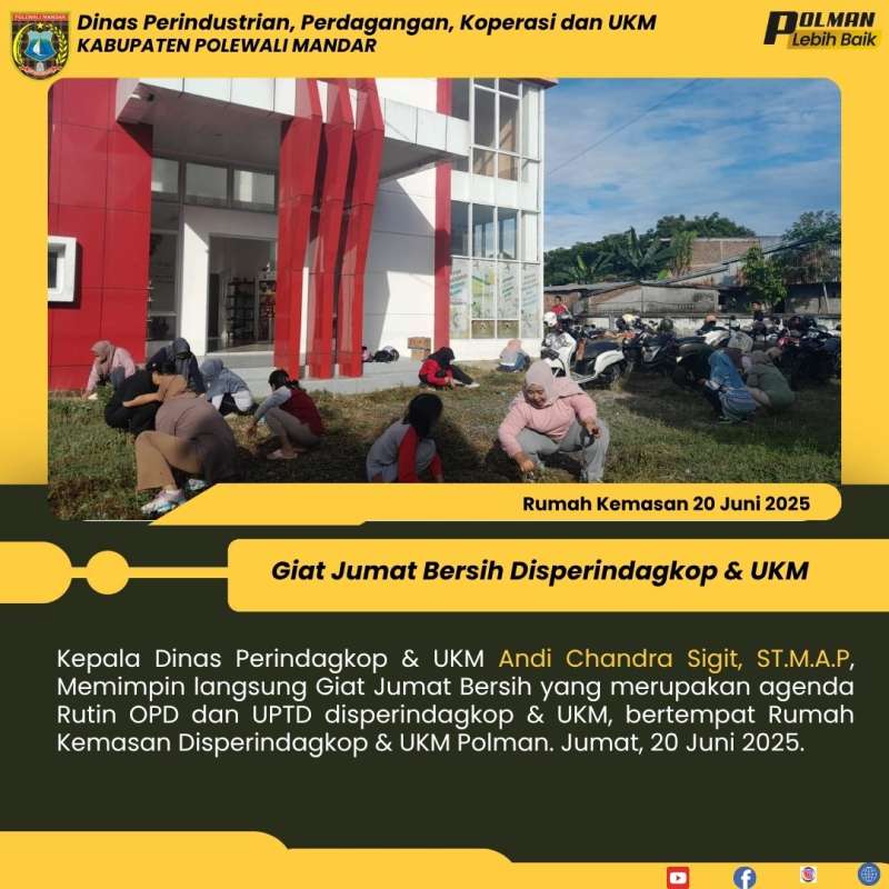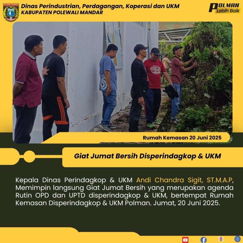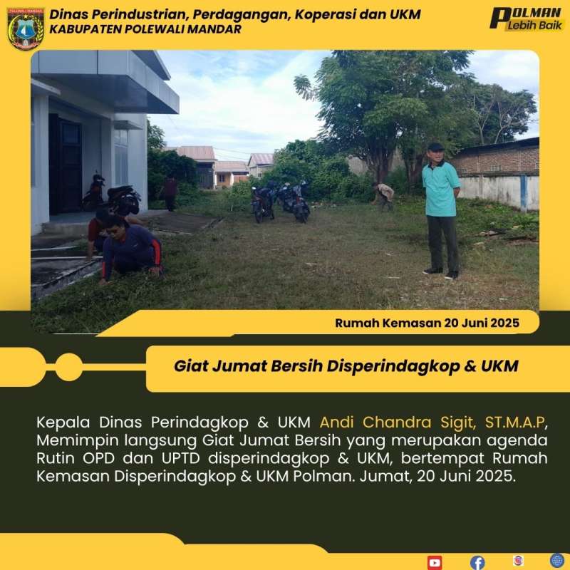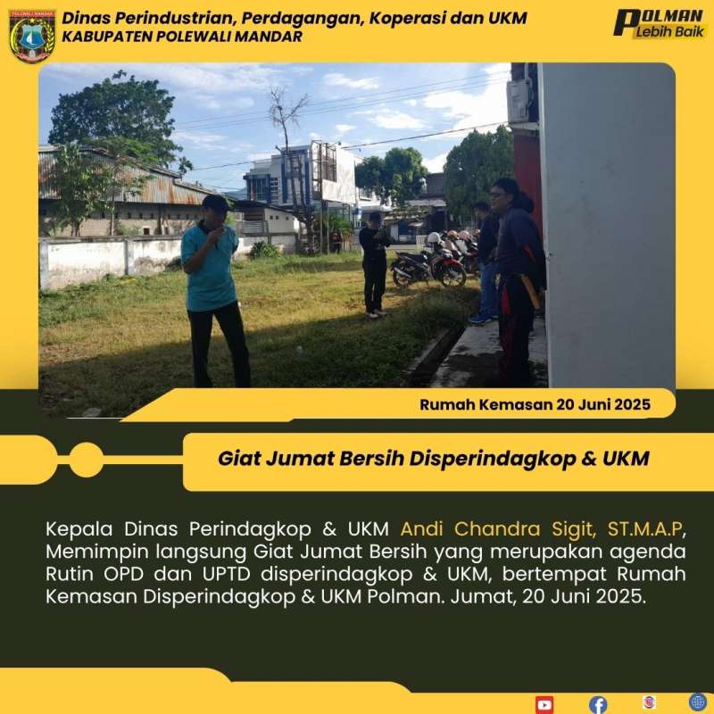 Kepala Dinas Perindagkop & UKM Andi Chandra Sigit, ST.M.A.P, Memimpin langsung Giat Jumat Bersih yang merupakan agenda Rutin OPD dan UPTD disperindagkop & UKM, bertempat Rumah Kemasan Disperindagkop & UKM Polman. Jumat, 20 Juni 2025.