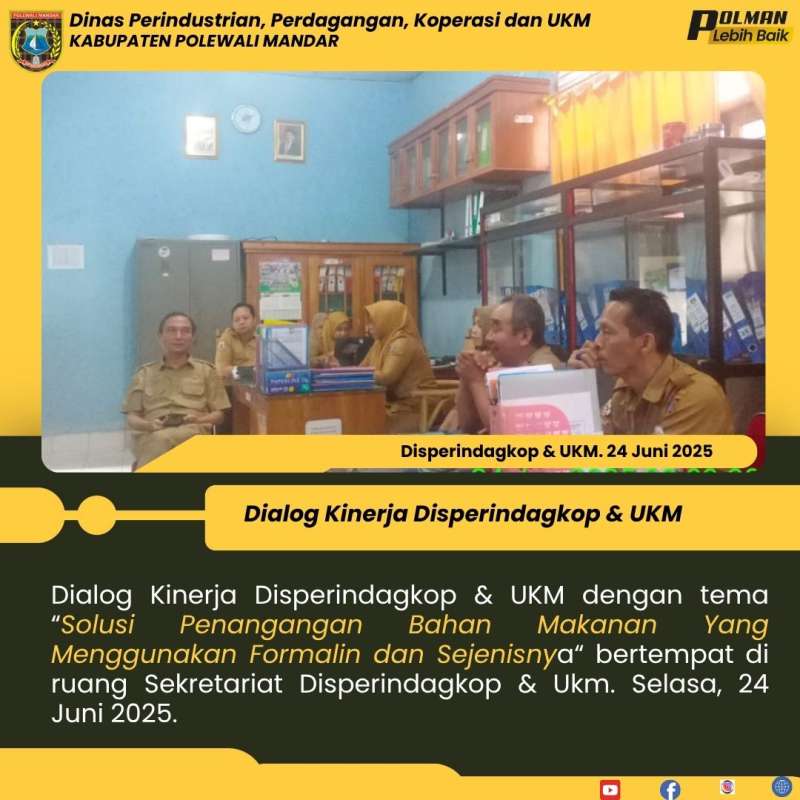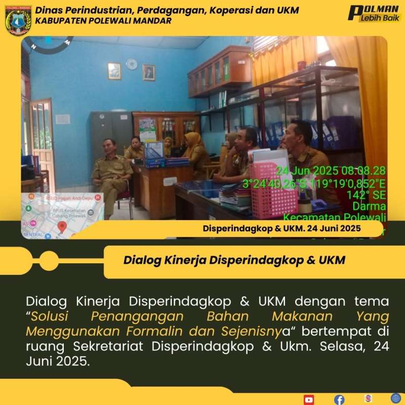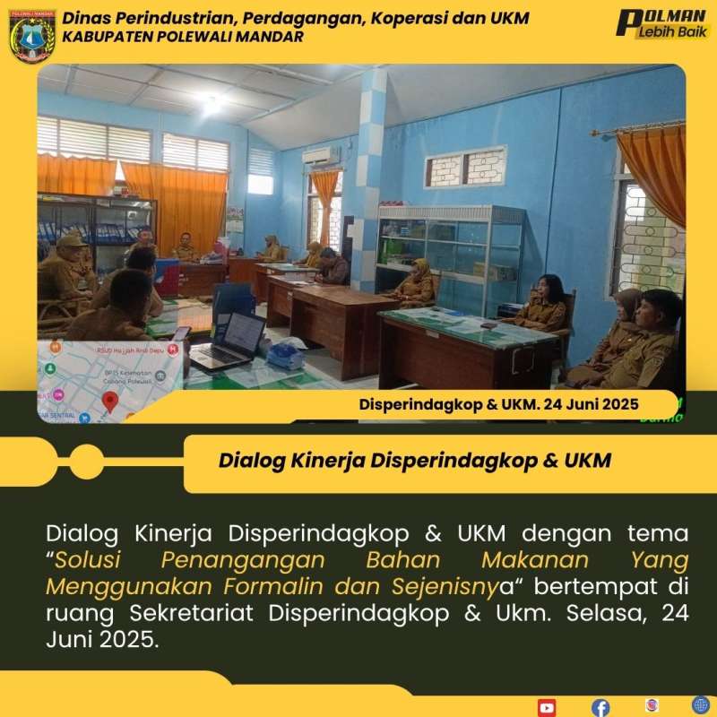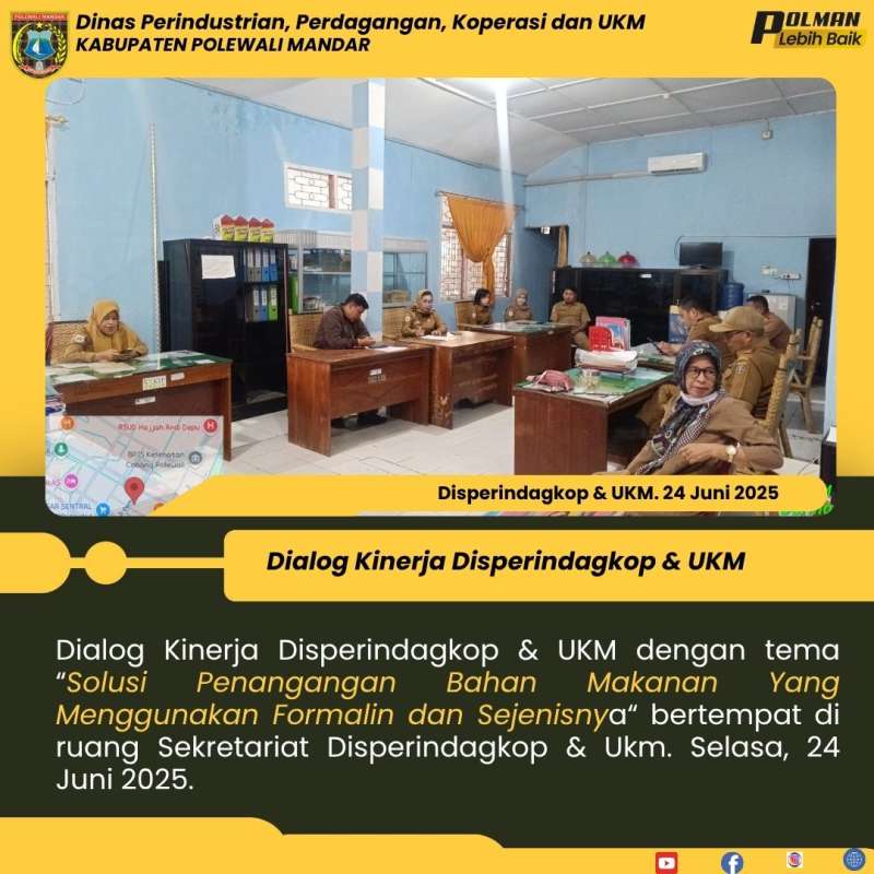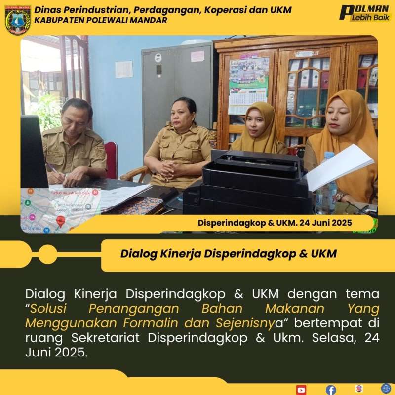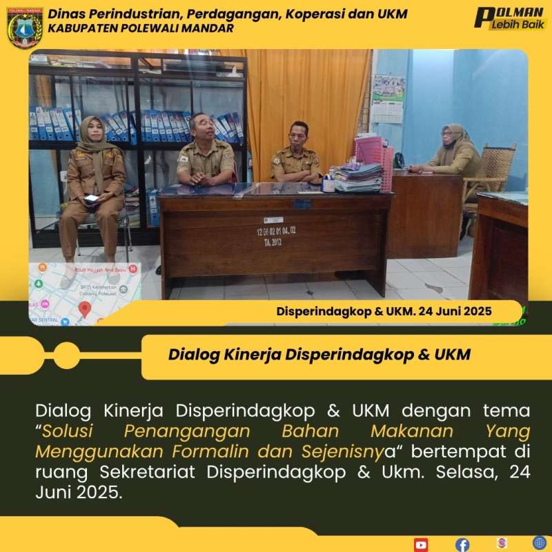 Dialog Kinerja Disperindagkop & UKM dengan tema “Solusi Penangangan Bahan Makanan Yang Menggunakan Formalin dan Sejenisnya“ bertempat di ruang Sekretariat Disperindagkop & Ukm. Selasa, 24 Juni 2025.