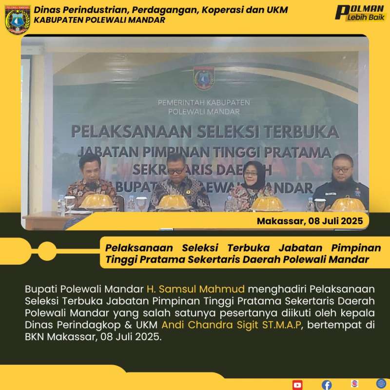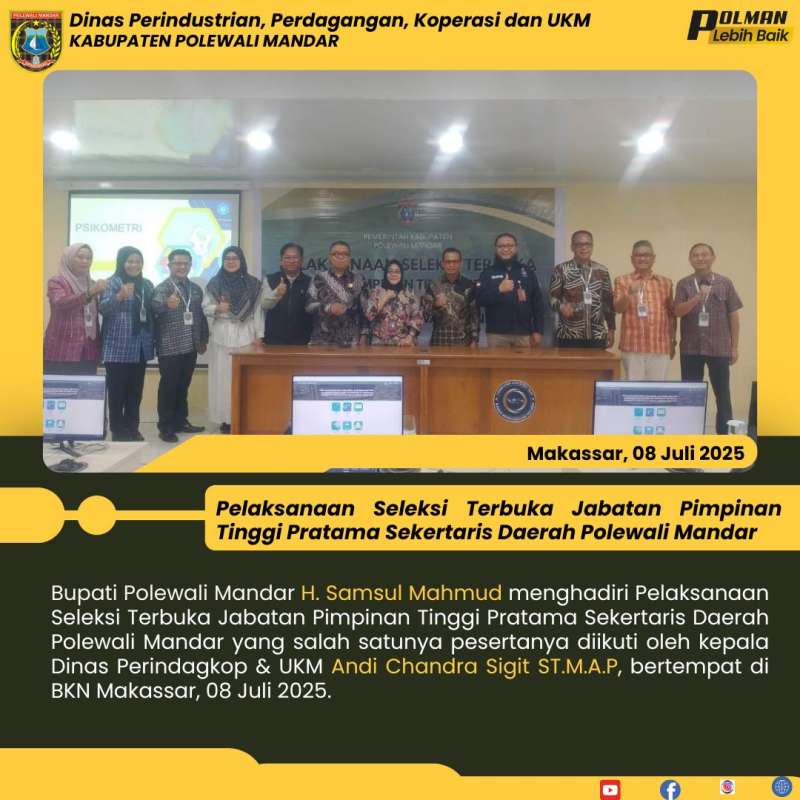 Bupati Polewali Mandar H. Samsul Mahmud menghadiri Pelaksanaan Seleksi Terbuka Jabatan Pimpinan Tinggi Pratama Sekertaris Daerah Polewali Mandar yang salah satunya pesertanya diikuti oleh kepala Dinas Perindagkop & UKM Andi Chandra Sigit ST.M.A.P, bertempat di BKN Makassar, 08 Juli 2025.