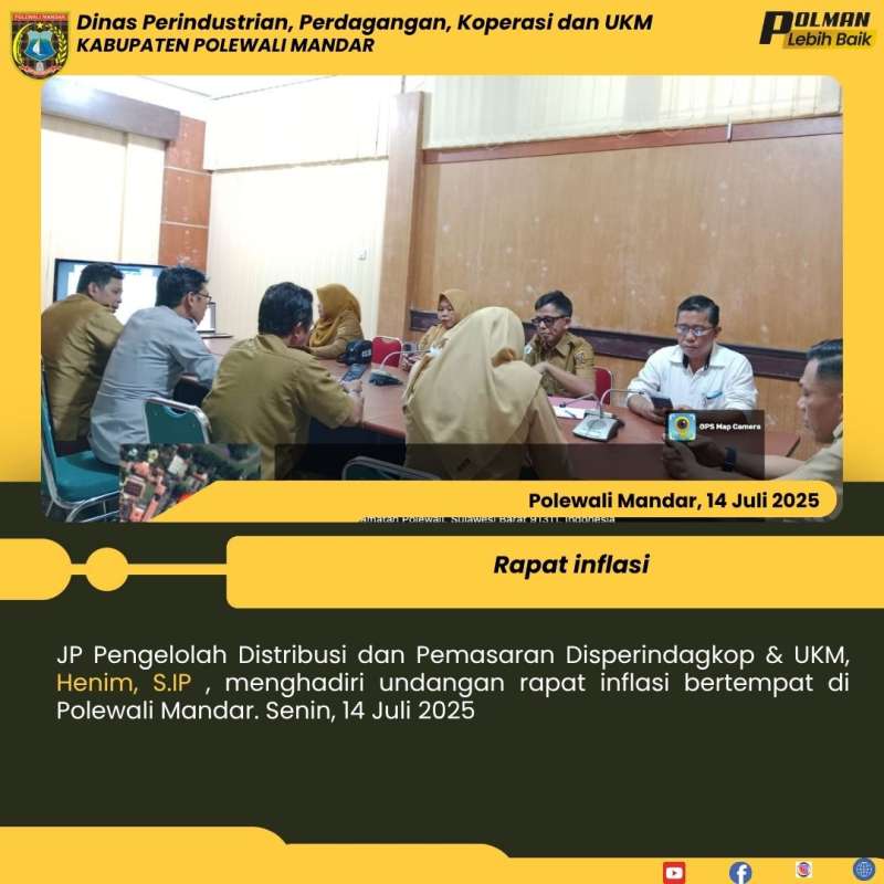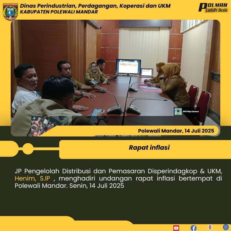 JP Pengelolah Distribusi dan Pemasaran Disperindagkop & UKM, Henim, S.IP , menghadiri undangan rapat inflasi bertempat di Polewali Mandar. Senin, 14 Juli 2025