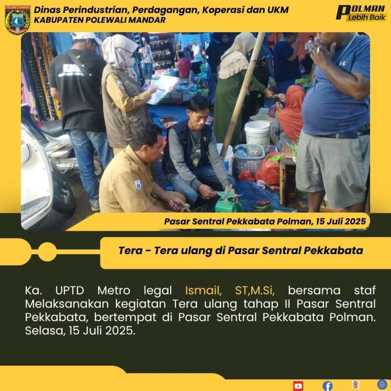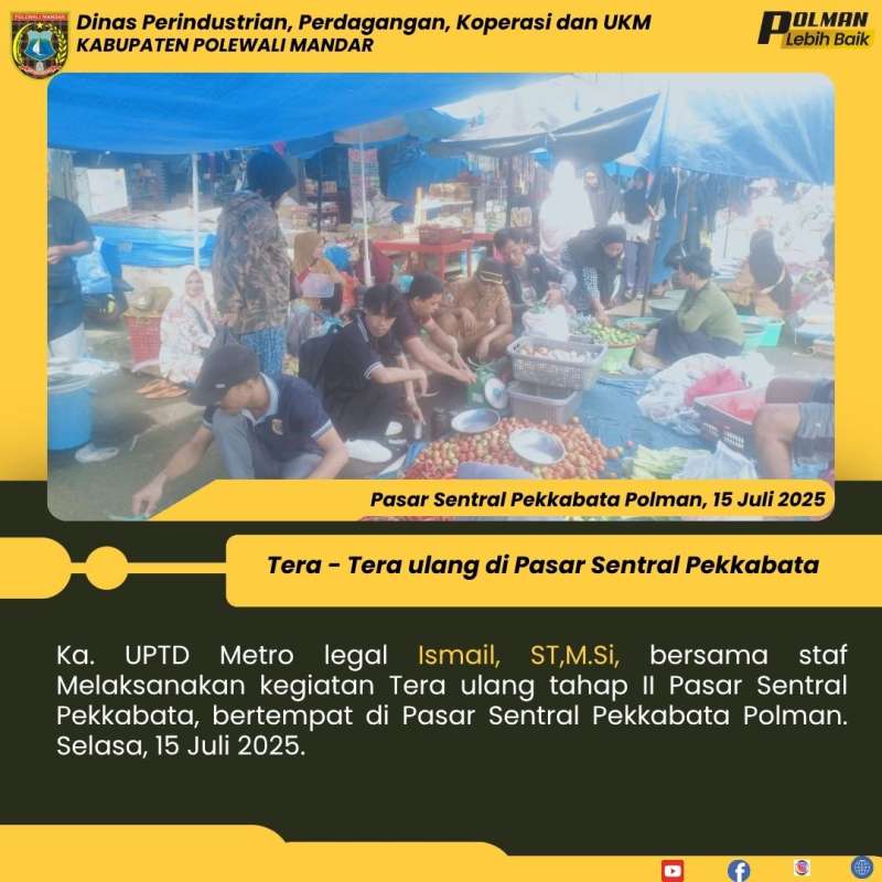 Ka. UPTD Metro legal Ismail, ST,M.Si, bersama staf Melaksanakan kegiatan Tera ulang tahap II Pasar Sentral Pekkabata, bertempat di Pasar Sentral Pekkabata Polman. Selasa, 15 Juli 2025.