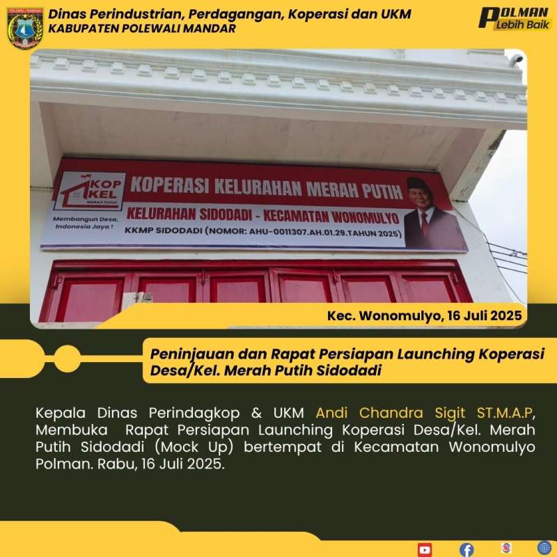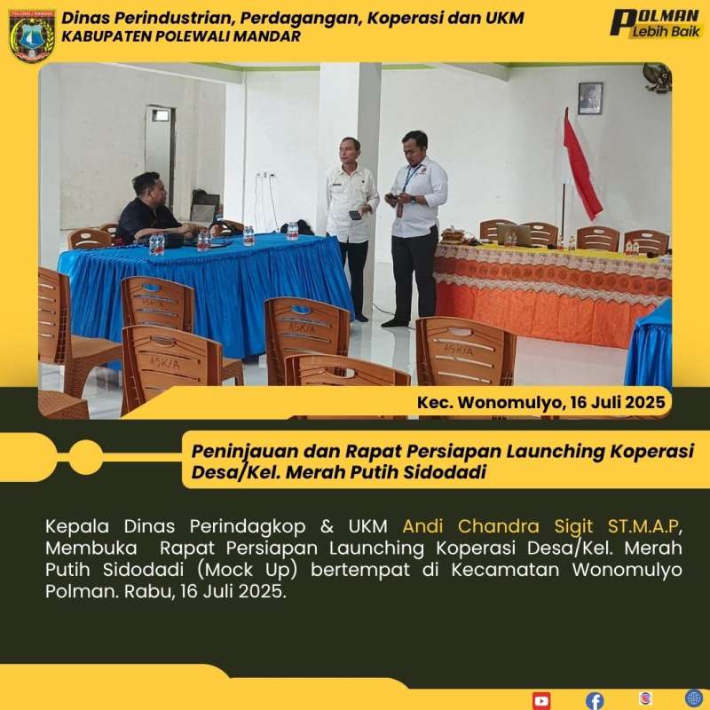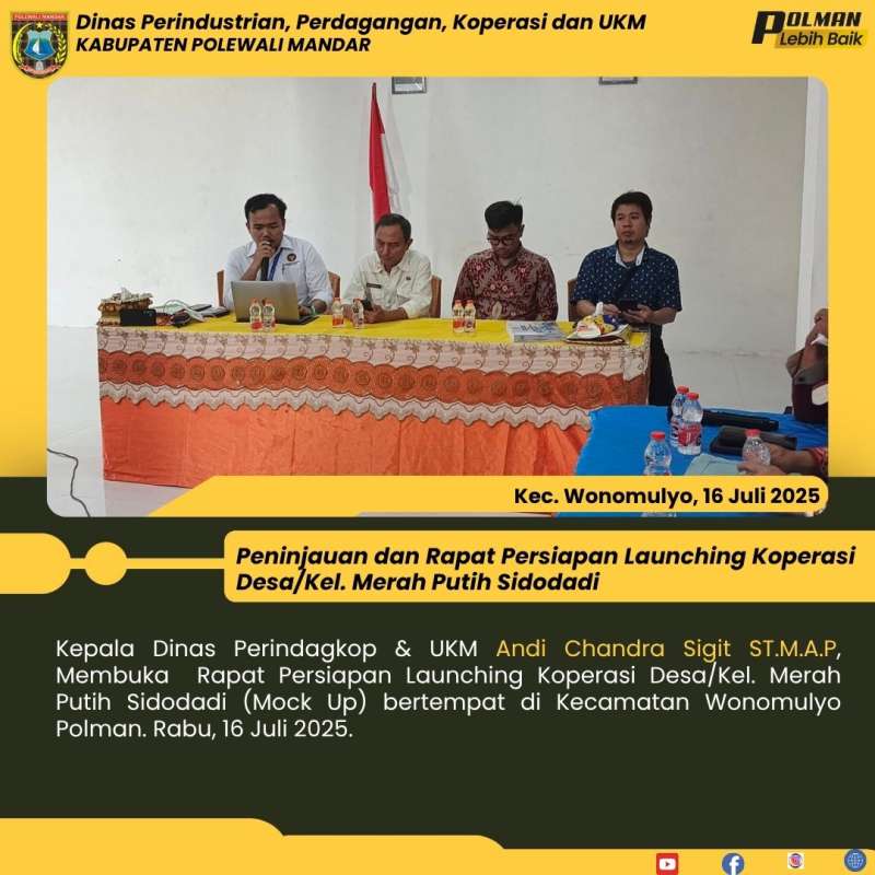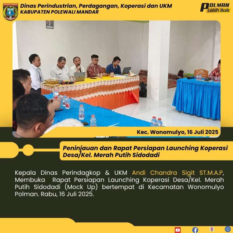 Kepala Dinas Perindagkop & UKM Andi Chandra Sigit ST.M.A.P, Membuka Rapat Persiapan Launching Koperasi Desa/Kel. Merah Putih Sidodadi (Mock Up) bertempat di Kecamatan Wonomulyo Polman. Rabu, 16 Juli 2025.