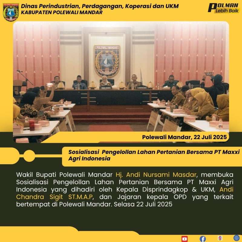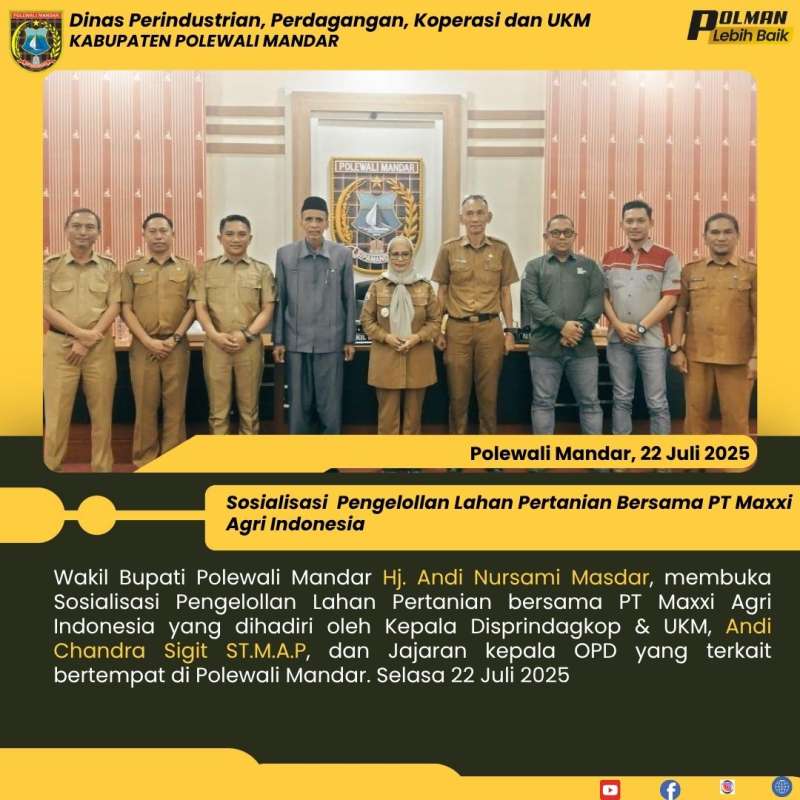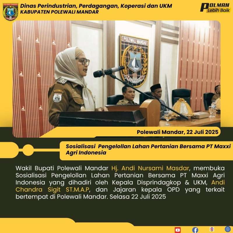 Wakil Bupati Polewali Mandar Hj. Andi Nursami Masdar, membuka Sosialisasi Pengelollan Lahan Pertanian bersama PT Maxxi Agri Indonesia yang dihadiri oleh Kepala Disprindagkop & UKM, Andi Chandra Sigit ST.M.A.P, dan Jajaran kepala OPD yang terkait bertempat di Polewali Mandar. Selasa 22 Juli 2025