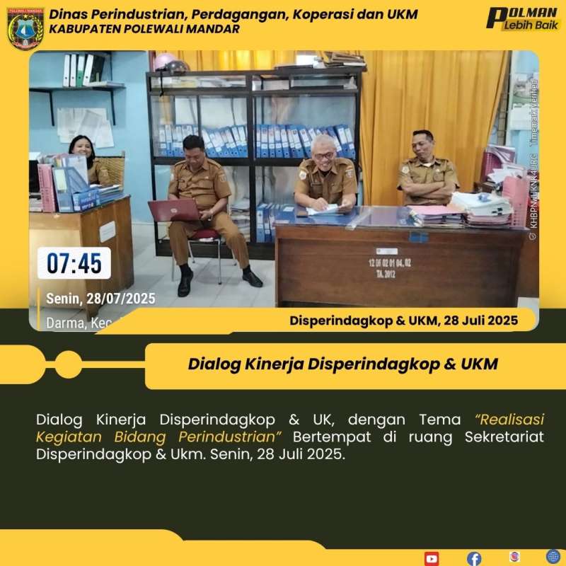 Dialog Kinerja Disperindagkop & UK, dengan Tema “Realisasi Kegiatan Bidang Perindustrian” Bertempat di ruang Sekretariat Disperindagkop & Ukm. Senin, 28 Juli 2025.