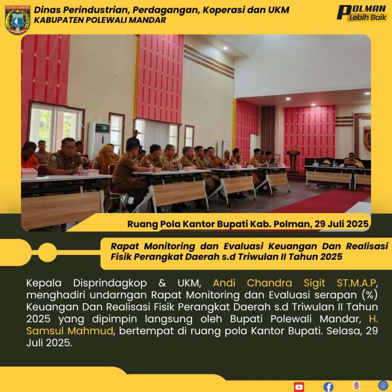 Kepala Disprindagkop & UKM, Andi Chandra Sigit ST.M.A.P, menghadiri undarngan Rapat Monitoring dan Evaluasi serapan (%) Keuangan Dan Realisasi Fisik Perangkat Daerah s.d Triwulan II Tahun 2025 yang dipimpin langsung oleh Bupati Polewali Mandar, H. Samsul Mahmud, bertempat di ruang pola Kantor Bupati. Selasa, 29 Juli 2025.