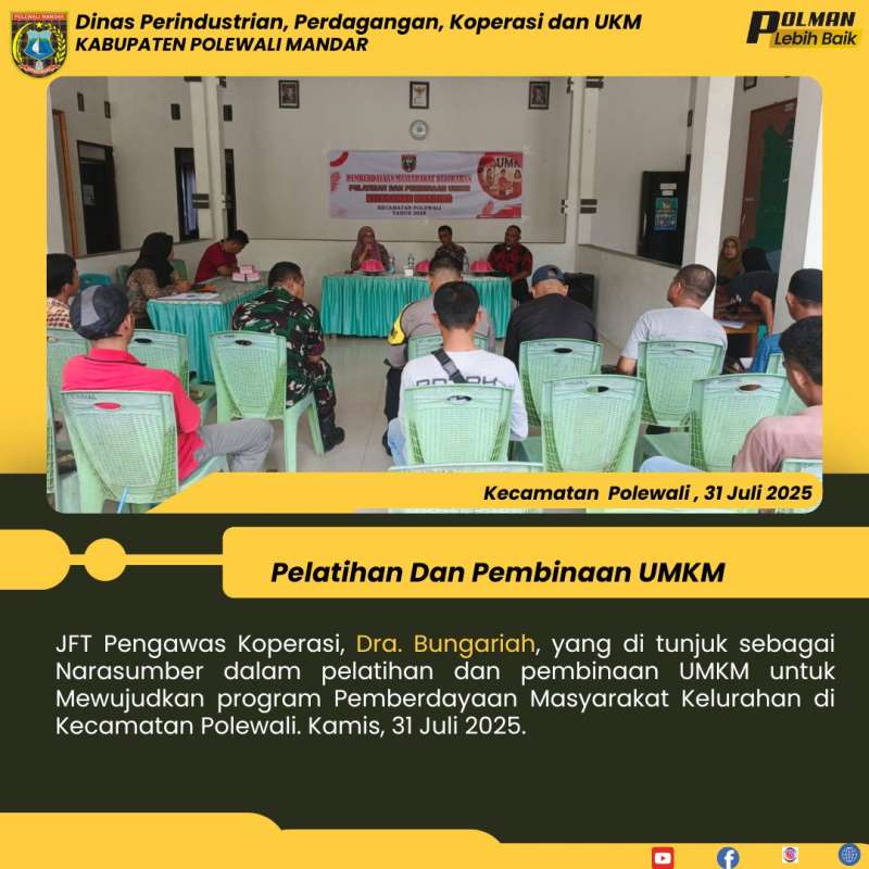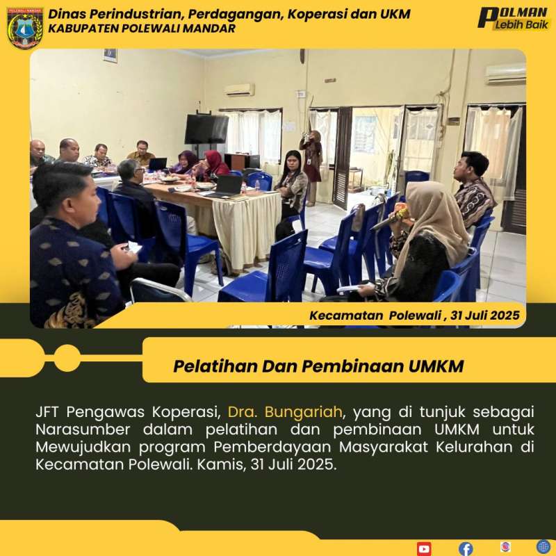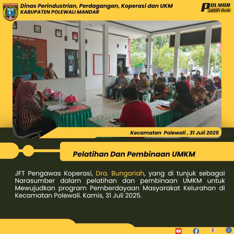 JFT Pengawas Koperasi, Dra. Bungariah, yang di tunjuk sebagai Narasumber dalam pelatihan dan pembinaan UMKM untuk Mewujudkan program Pemberdayaan Masyarakat Kelurahan di Kecamatan Polewali. Kamis, 31 Juli 2025.