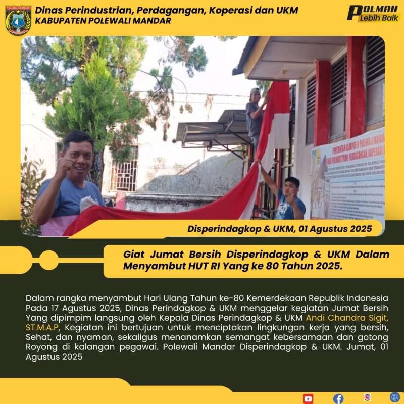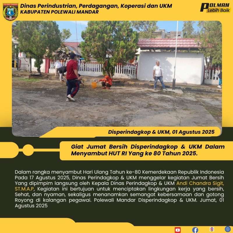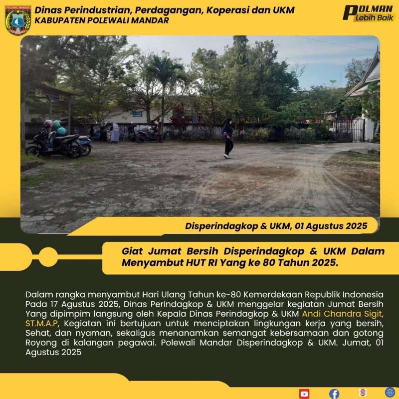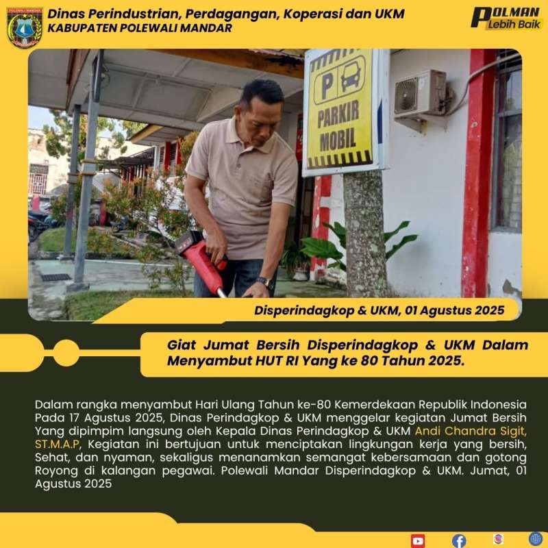 Dinas Perindustrian, Perdagangan, Koperasi dan UKM Kabupaten Polewali Mandar kembali menggelar kegiatan Jumat Bersih pada hari ini. Seluruh pejabat struktural, staf, hingga pegawai non-ASN terlibat aktif dalam menjaga kebersihan lingkungan kantor. Jumat, 07 November 2025...