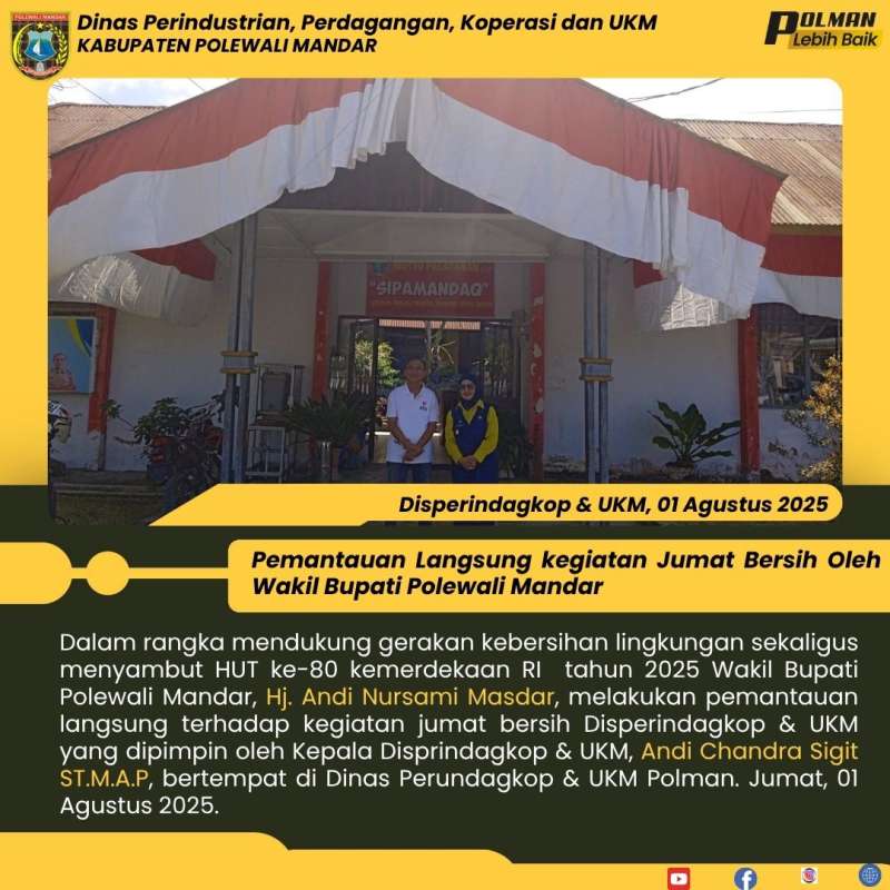Dalam rangka mendukung gerakan kebersihan lingkungan sekaligus menyambut HUT ke-80 kemerdekaan RI tahun 2025 Wakil Bupati Polewali Mandar, Hj. Andi Nursami Masdar, melakukan pemantauan langsung terhadap kegiatan jumat bersih Disperindagkop & UKM yang dipimpin oleh Kepala Disprindagkop & UKM, Andi Chandra Sigit ST.M.A.P, bertempat di Dinas Perundagkop & UKM Polman. Jumat, 01 Agustus 2025.