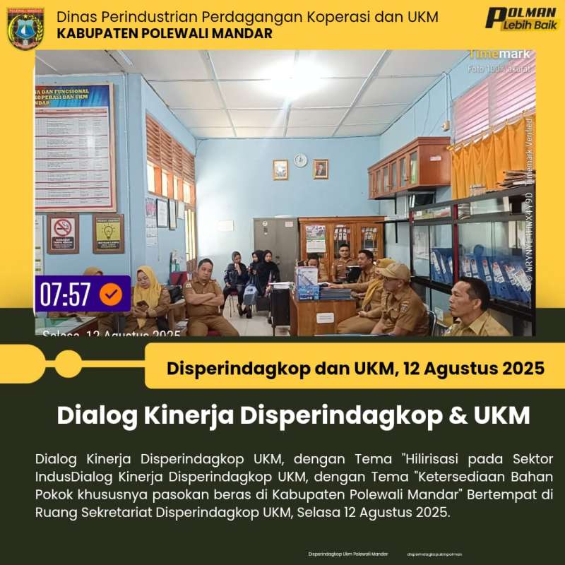 Dialog Kinerja Disperindagkop UKM, dengan Tema "Ketersediaan Bahan Pokok khususnya pasokan beras di Kabupaten Polewali Mandar" Bertempat di Ruang Sekretariat Disperindagkop UKM, Selasa 12 Agustus 2025.