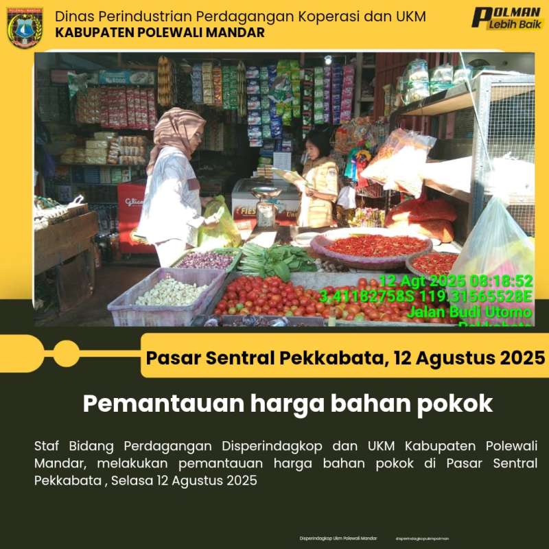Staf Bidang Perdagangan Disperindagkop dan UKM Kabupaten Polewali Mandar, Malakukan Pemantauan Harga Bahan Pokok di Pasar Sentra Pekkabata, Selasa 12 Agustus 2025.