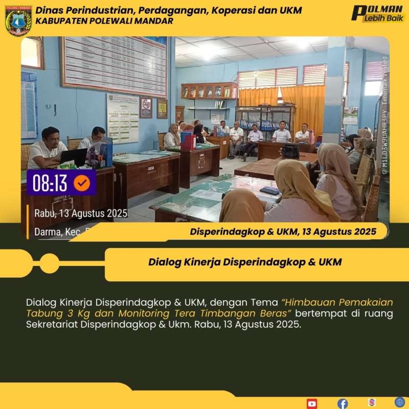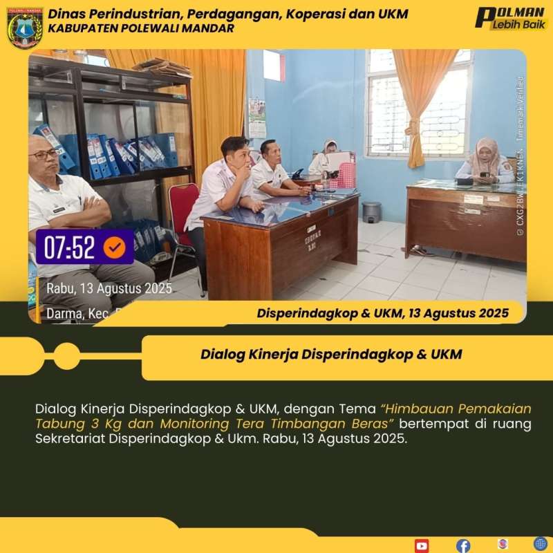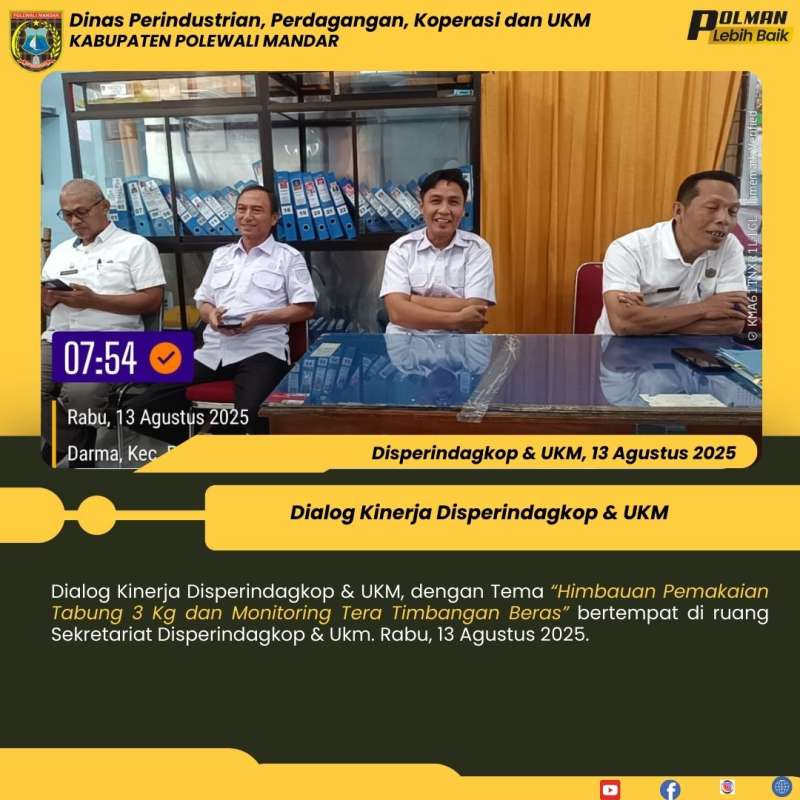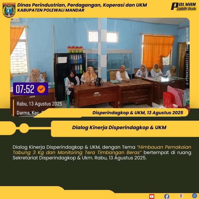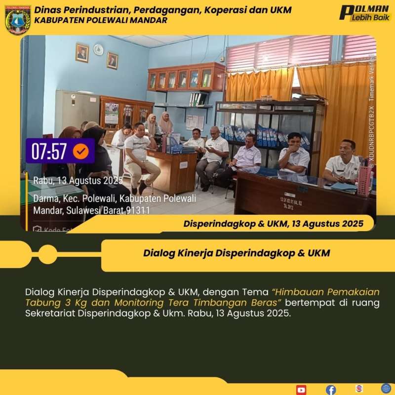 Dialog Kinerja Disperindagkop & UKM, dengan Tema “Himbauan Pemakaian Tabung 3 Kg dan Monitoring Tera Timbangan Beras” bertempat di ruang Sekretariat Disperindagkop & Ukm. Rabu, 13 Agustus 2025.