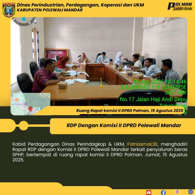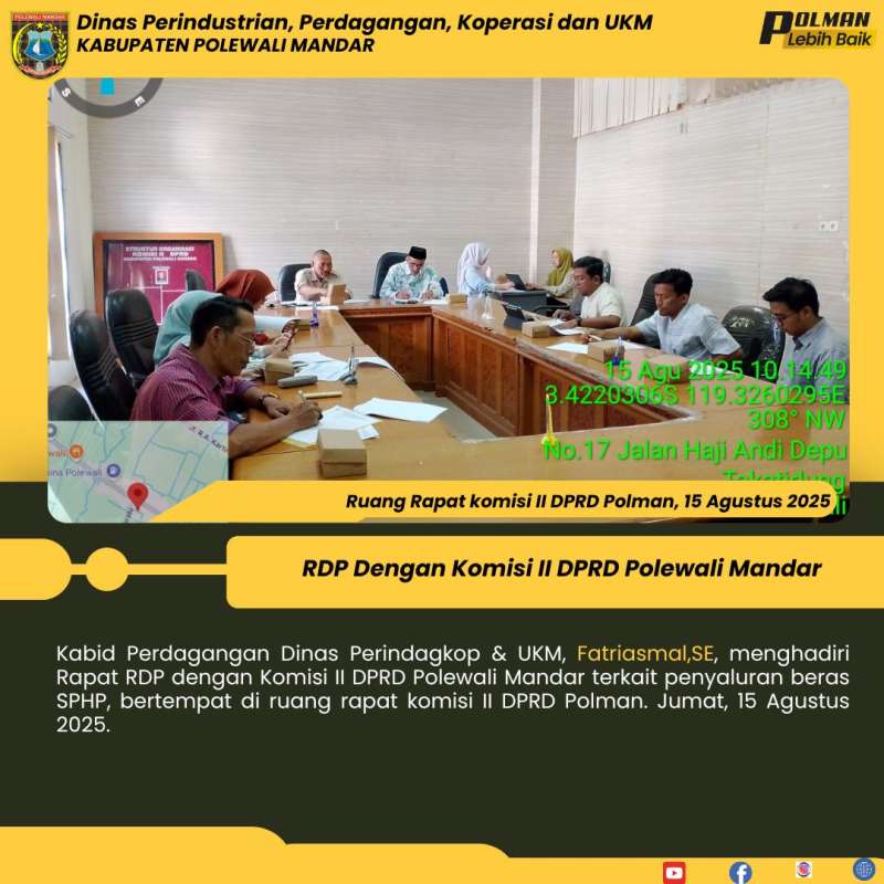 Kabid Perdagangan Dinas Perindagkop & UKM, Fatriasmal,SE, menghadiri Rapat RDP dengan Komisi II DPRD Polewali Mandar terkait penyaluran beras SPHP, bertempat di ruang rapat komisi II DPRD Polman. Jumat, 15 Agustus 2025.