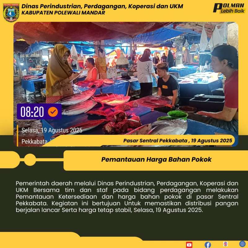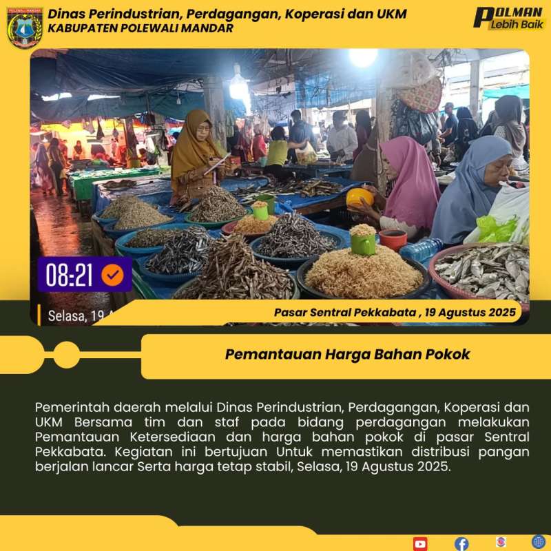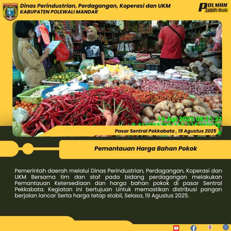 Pemerintah daerah melalui Dinas Perindustrian, Perdagangan, Koperasi dan UKM Bersama tim dan staf pada bidang perdagangan melakukan Pemantauan Ketersediaan dan harga bahan pokok di pasar Sentral Pekkabata. Kegiatan ini bertujuan Untuk memastikan distribusi pangan berjalan lancar Serta harga tetap stabil, Selasa, 19 Agustus 2025.