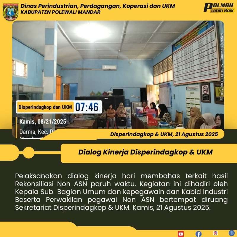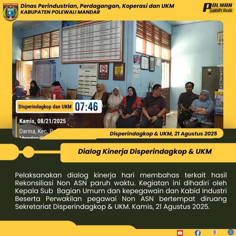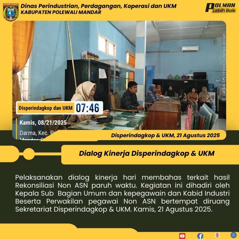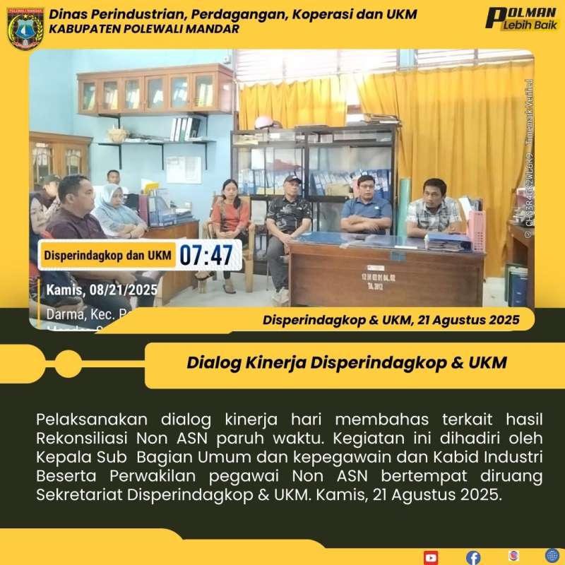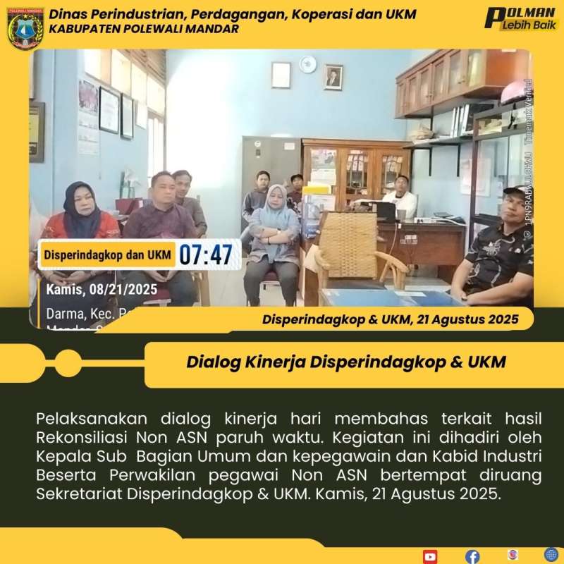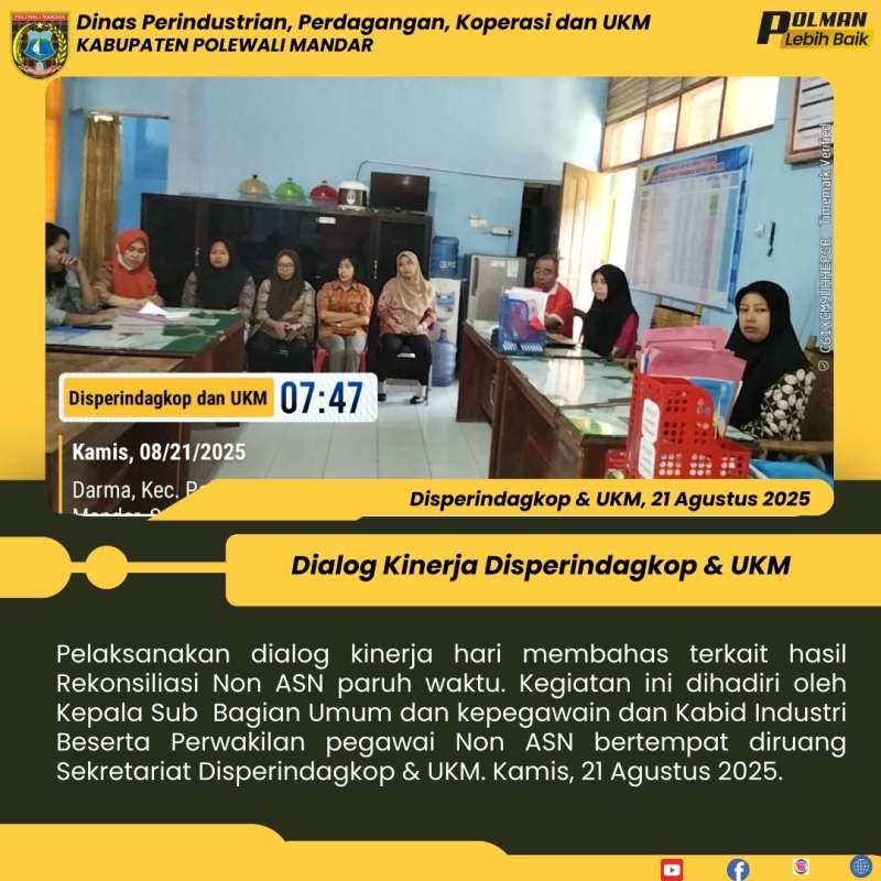 Pelaksanakan dialog kinerja hari membahas terkait hasil Rekonsiliasi Non ASN paruh waktu. Kegiatan ini dihadiri oleh Kepala Sub Bagian Umum dan kepegawain dan Kabid Industri Beserta Perwakilan pegawai Non ASN bertempat diruang Sekretariat Disperindagkop & UKM. Kamis, 21 Agustus 2025.