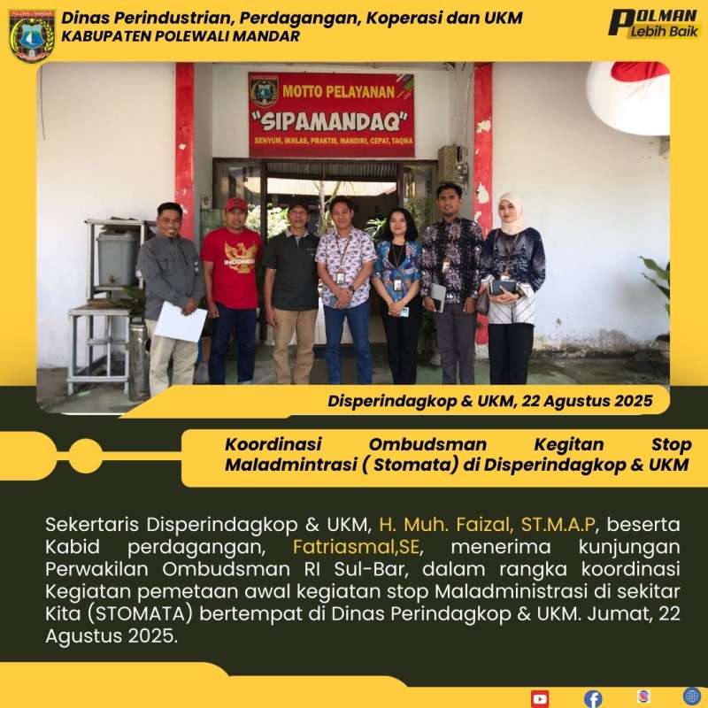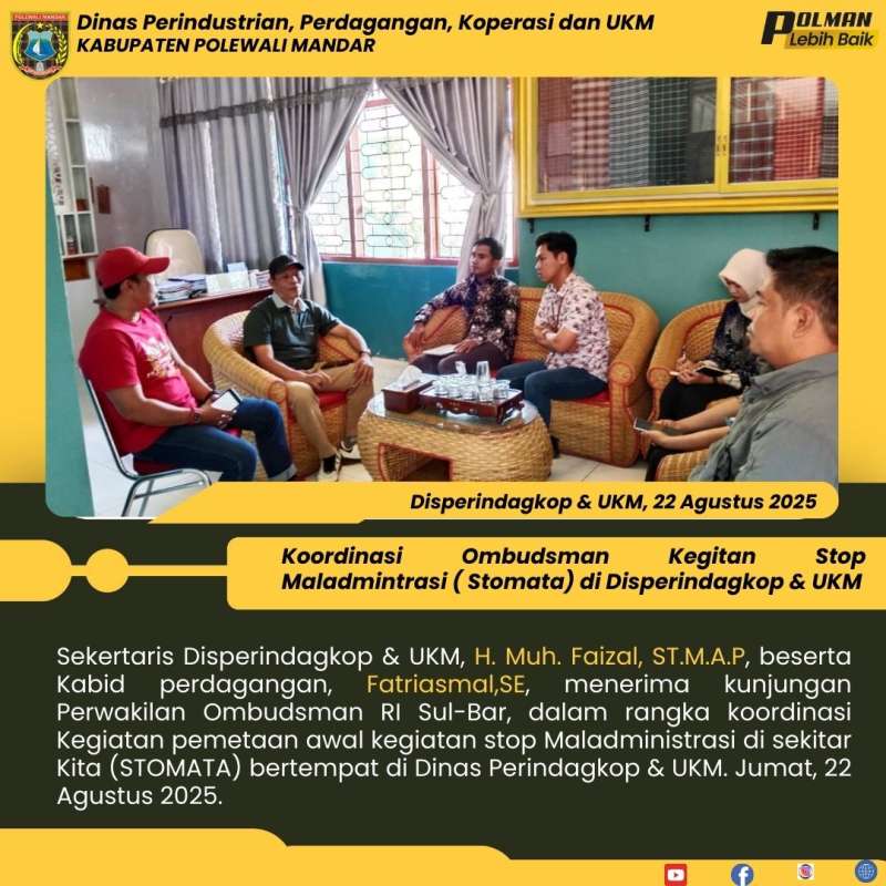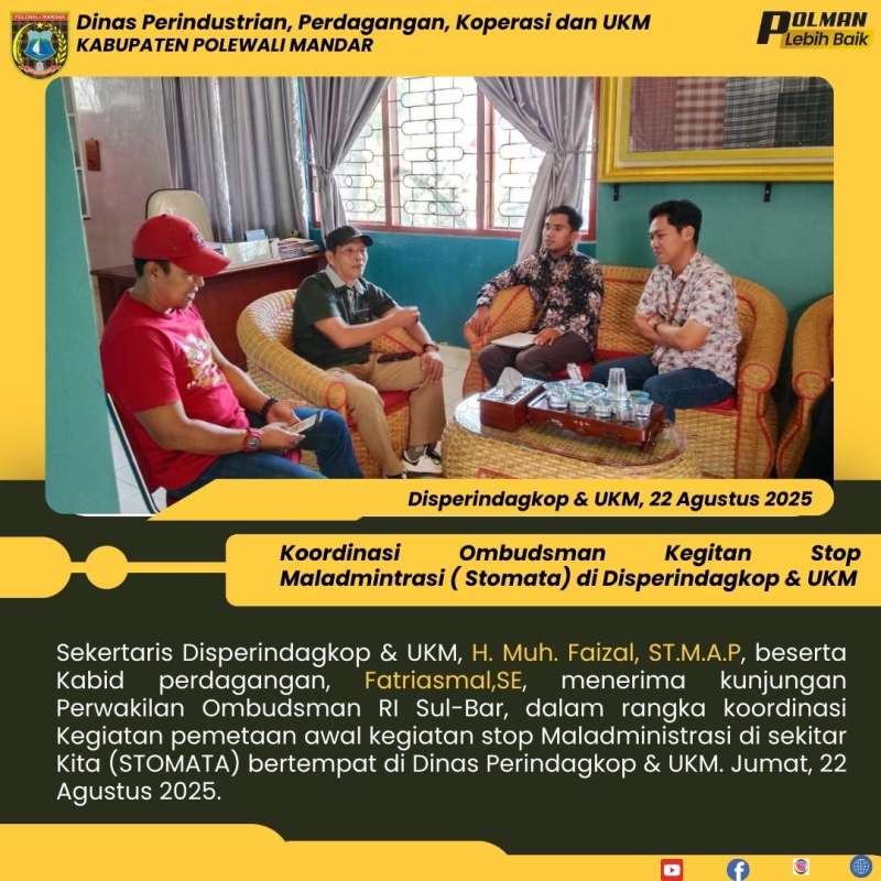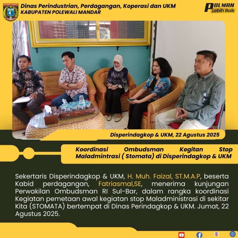 Sekertaris Disperindagkop & UKM, H. Muh. Faizal, ST.M.A.P, beserta Kabid perdagangan, Fatriasmal,SE, menerima kunjungan Perwakilan Ombudsman RI Sul-Bar, dalam rangka koordinasi Kegiatan pemetaan awal kegiatan stop Maladministrasi di sekitar Kita (STOMATA) bertempat di Dinas Perindagkop & UKM. Jumat, 22 Agustus 2025.