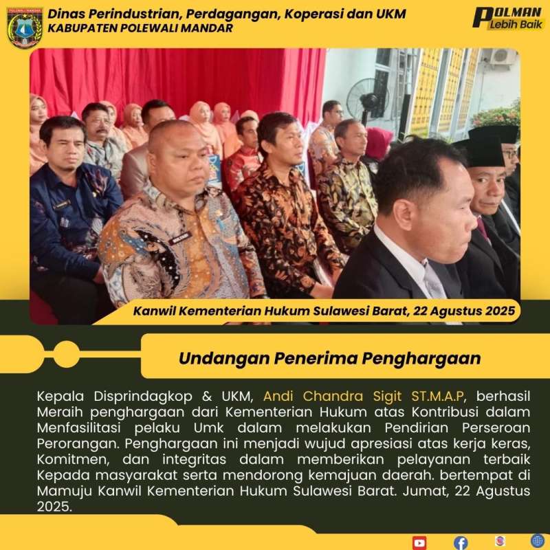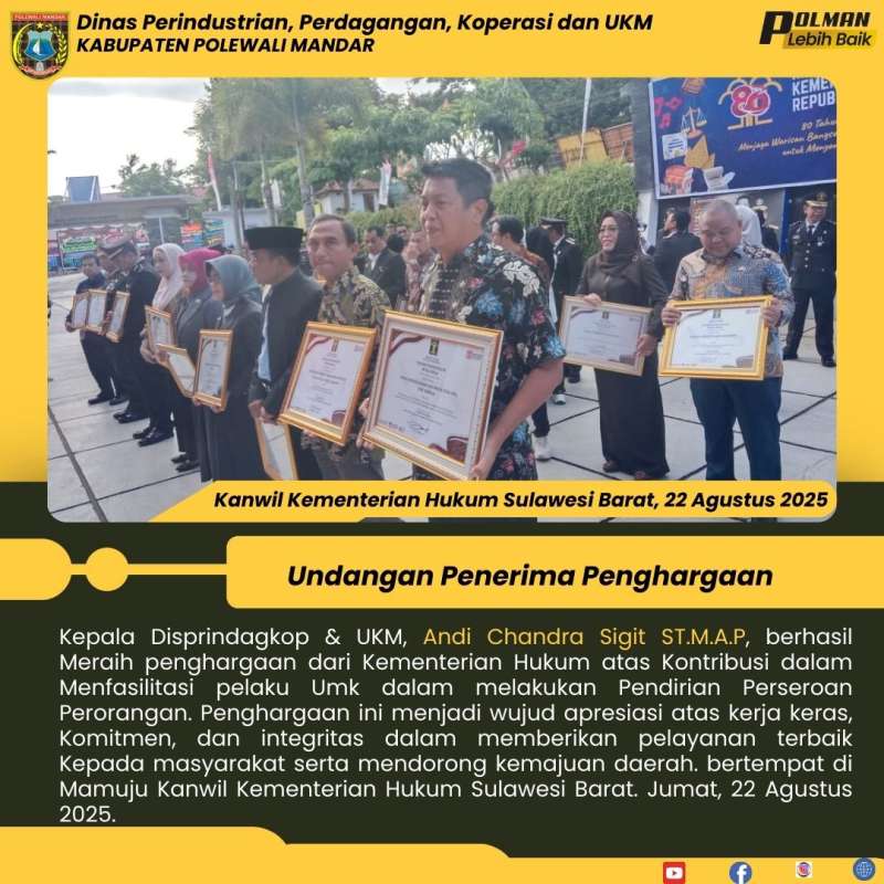 Kepala Disprindagkop & UKM, Andi Chandra Sigit ST.M.A.P, berhasil Meraih penghargaan dari Kementerian Hukum atas Kontribusi dalam Menfasilitasi pelaku Umk dalam melakukan Pendirian Perseroan Perorangan. Penghargaan ini menjadi wujud apresiasi atas kerja keras, Komitmen, dan integritas dalam memberikan pelayanan terbaik Kepada masyarakat serta mendorong kemajuan daerah. bertempat di Mamuju Kanwil Kementerian Hukum Sulawesi Barat. Jumat, 22 Agustus 2025.