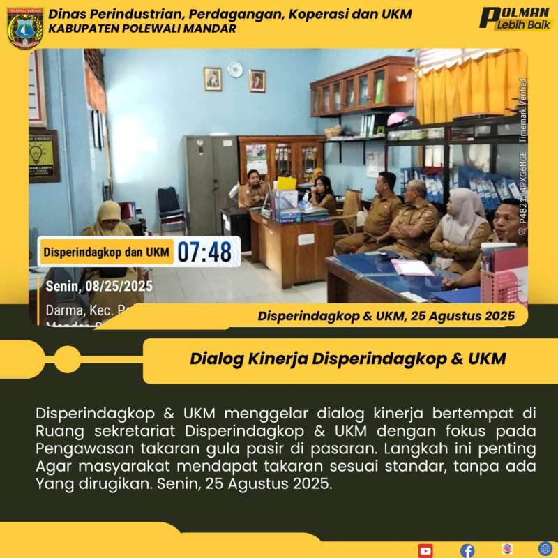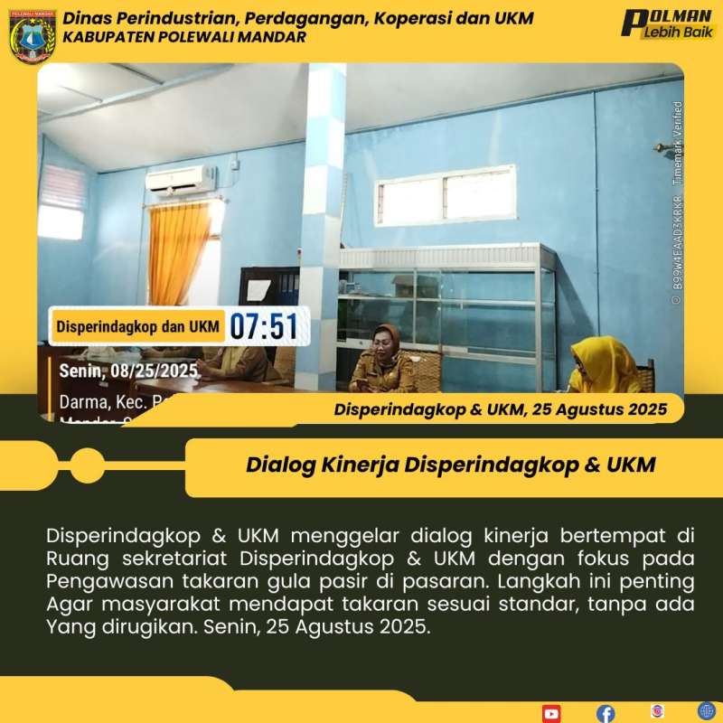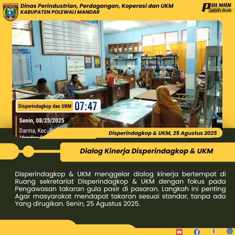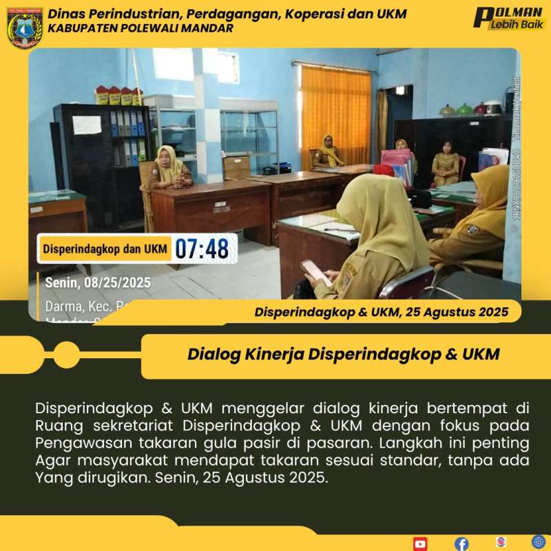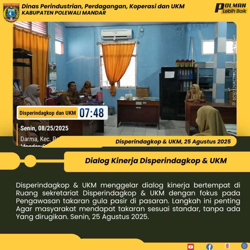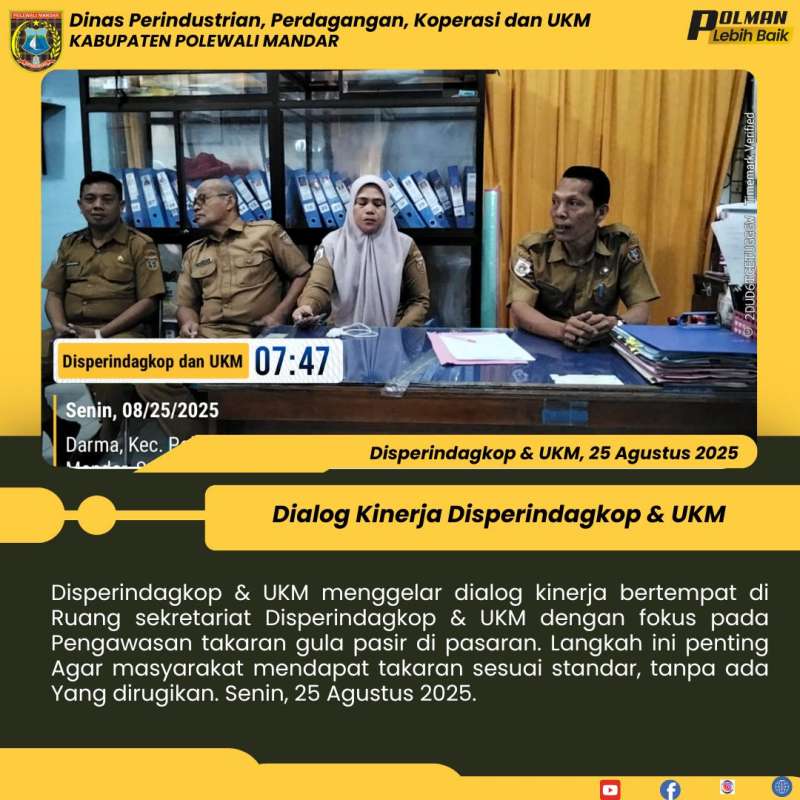 Disperindagkop & UKM menggelar dialog kinerja bertempat di Ruang sekretariat Disperindagkop & UKM dengan fokus pada Pengawasan takaran gula pasir di pasaran. Langkah ini penting Agar masyarakat mendapat takaran sesuai standar, tanpa ada Yang dirugikan. Senin, 25 Agustus 2025.
