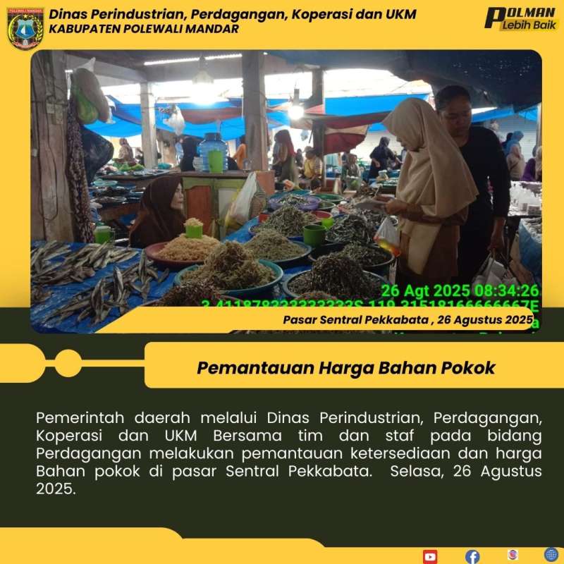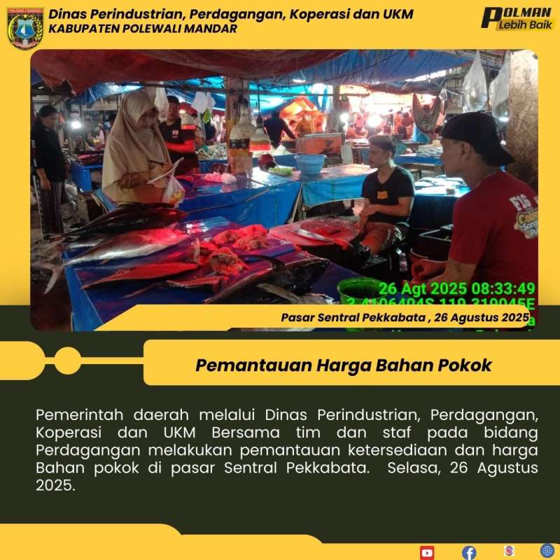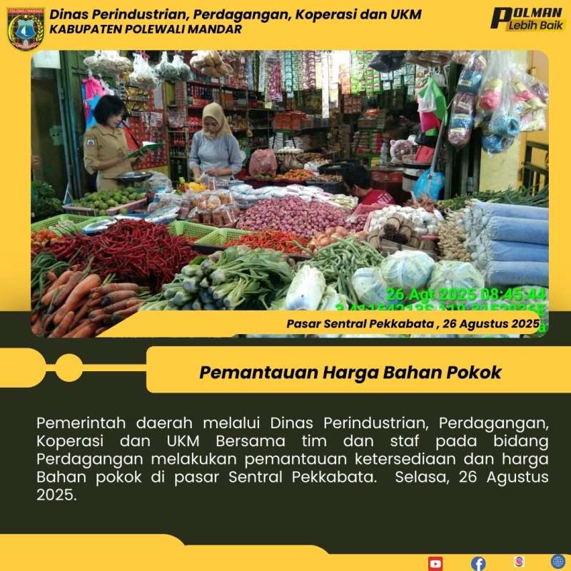 Pemerintah daerah melalui Dinas Perindustrian, Perdagangan, Koperasi dan UKM Bersama tim dan staf pada bidang Perdagangan melakukan pemantauan ketersediaan dan harga Bahan pokok di pasar Sentral Pekkabata. Selasa, 26 Agustus 2025.