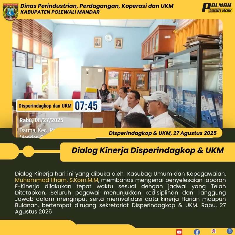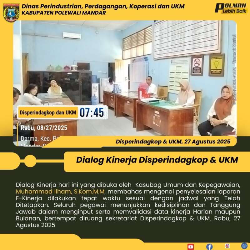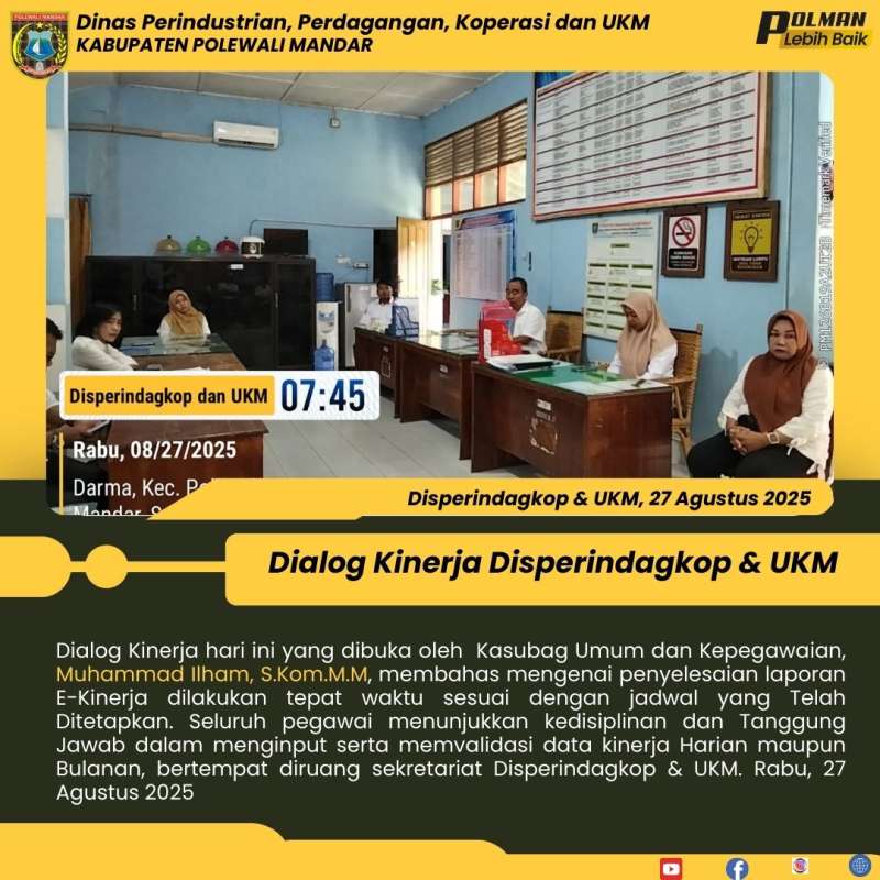 Dialog Kinerja hari ini yang dibuka oleh Kasubag Umum dan Kepegawaian, Muhammad Ilham, S.Kom.M.M, membahas mengenai penyelesaian laporan E-Kinerja dilakukan tepat waktu sesuai dengan jadwal yang Telah Ditetapkan. Seluruh pegawai menunjukkan kedisiplinan dan Tanggung Jawab dalam menginput serta memvalidasi data kinerja Harian maupun Bulanan, bertempat diruang sekretariat Disperindagkop & UKM. Rabu, 27 Agustus 2025