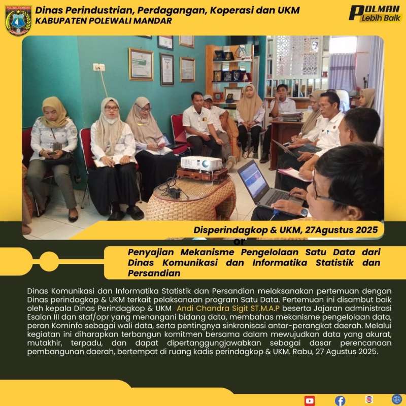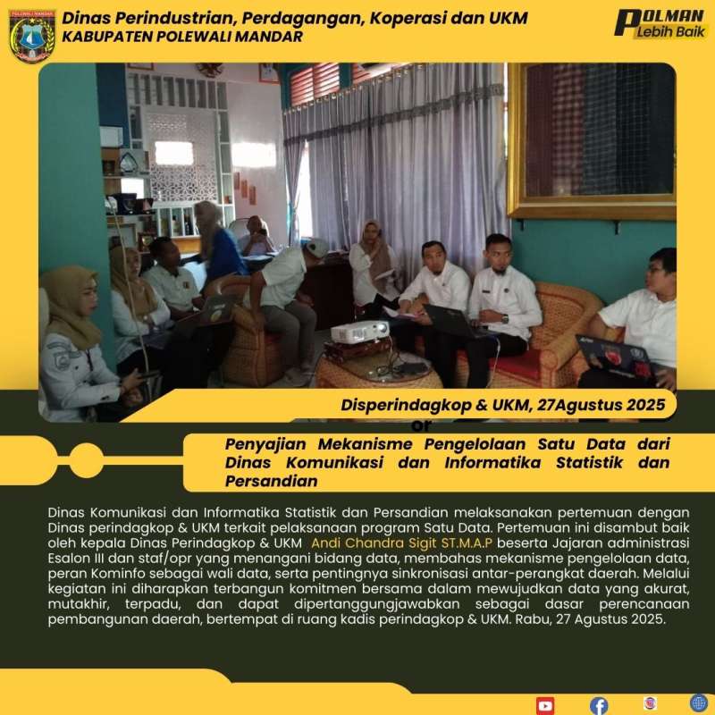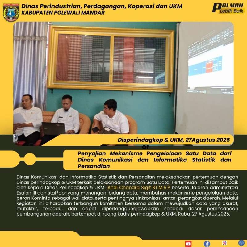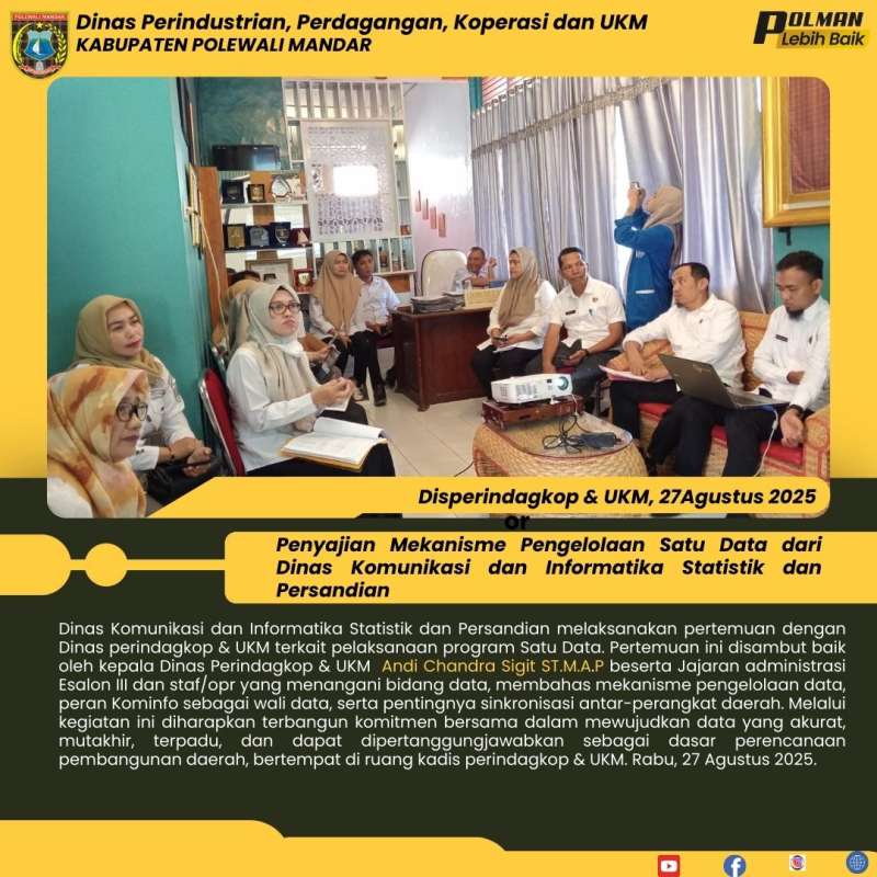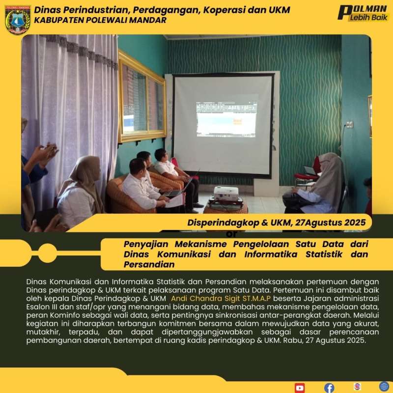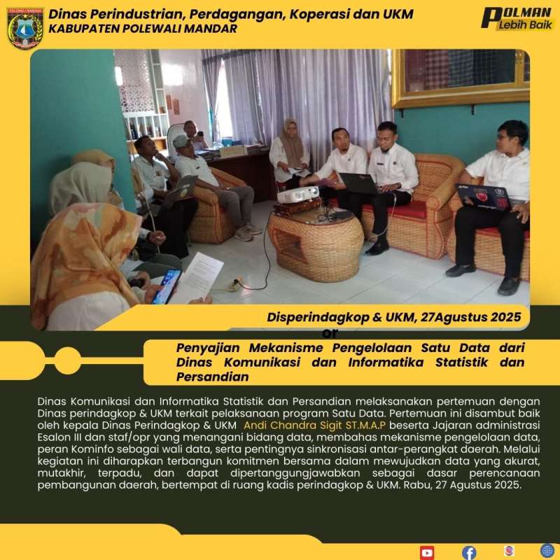 Dinas Komunikasi dan Informatika Statistik dan Persandian melaksanakan pertemuan dengan Dinas perindagkop & UKM terkait pelaksanaan program Satu Data. Pertemuan ini disambut baik oleh kepala Dinas Perindagkop & UKM Andi Chandra Sigit ST.M.A.P beserta Jajaran administrasi Esalon III dan staf/opr yang menangani bidang data, membahas mekanisme pengelolaan data, peran Kominfo sebagai wali data, serta pentingnya sinkronisasi antar-perangkat daerah. Melalui kegiatan ini diharapkan terbangun komitmen bersama dalam mewujudkan data yang akurat, mutakhir, terpadu, dan dapat dipertanggungjawabkan sebagai dasar perencanaan pembangunan daerah, bertempat di ruang kadis perindagkop & UKM. Rabu, 27 Agustus 2025.
