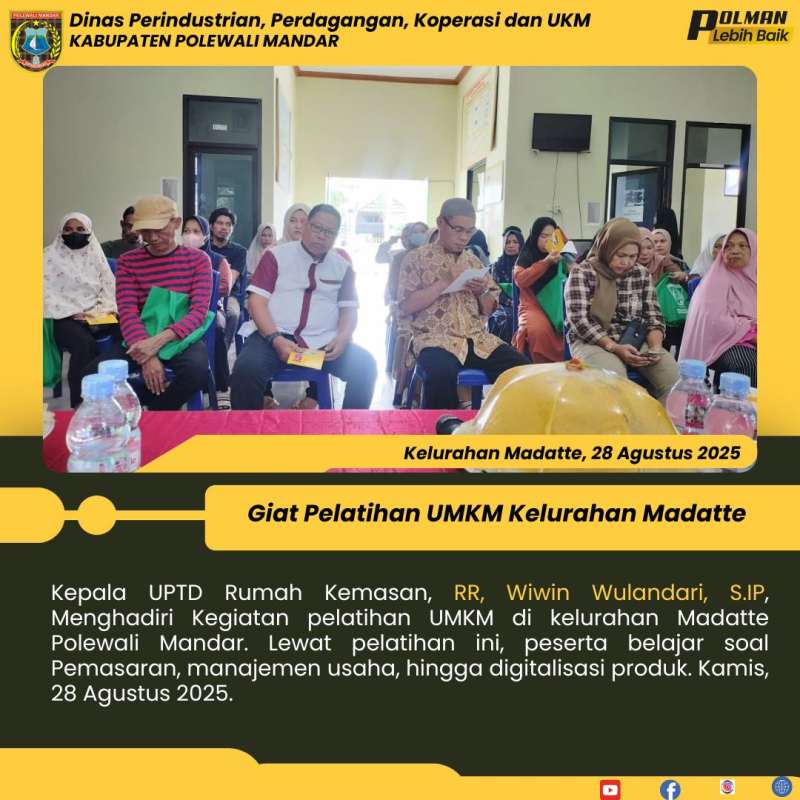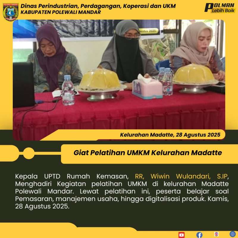 Kepala UPTD Rumah Kemasan, RR, Wiwin Wulandari, S.IP, Menghadiri Kegiatan pelatihan UMKM di kelurahan Madatte Polewali Mandar. Lewat pelatihan ini, peserta belajar soal Pemasaran, manajemen usaha, hingga digitalisasi produk. Kamis, 28 Agustus 2025.