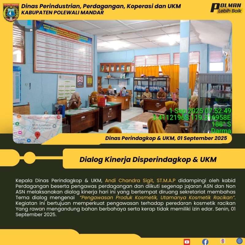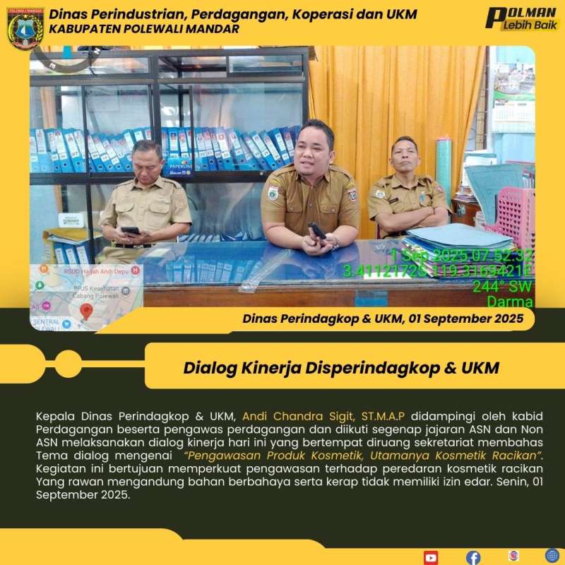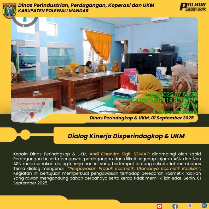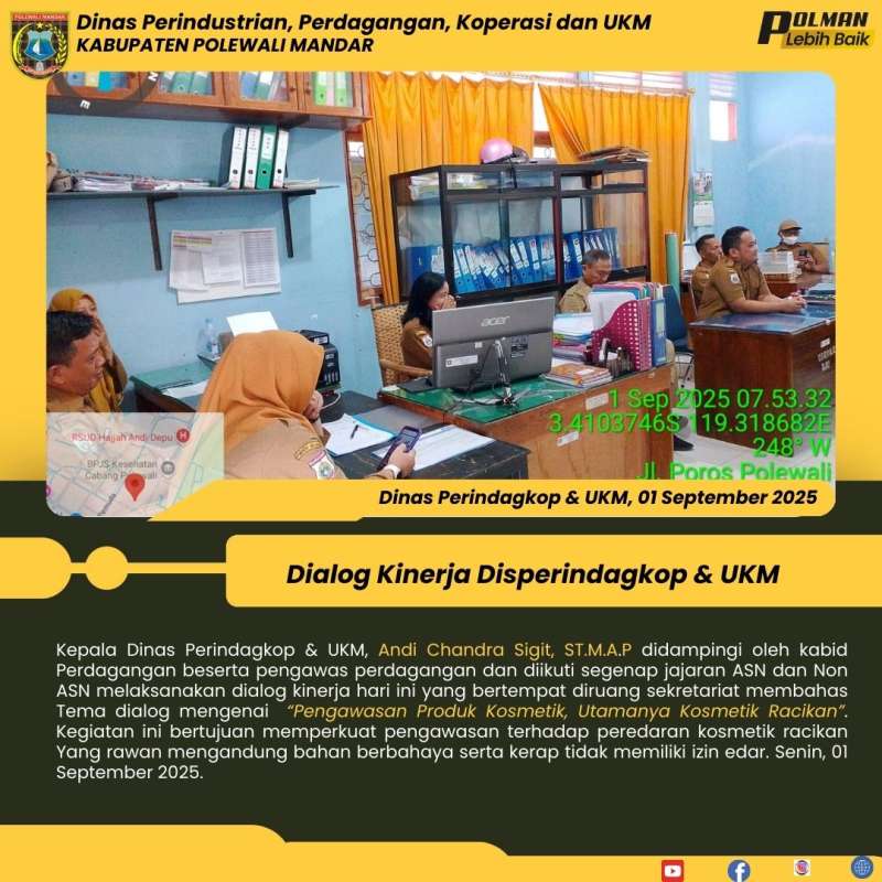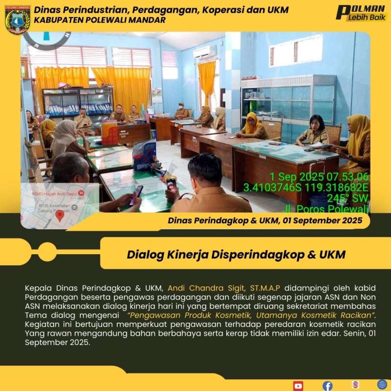 Kepala Dinas Perindagkop & UKM, Andi Chandra Sigit, ST.M.A.P didampingi oleh kabid Perdagangan beserta pengawas perdagangan dan diikuti segenap jajaran ASN dan Non ASN melaksanakan dialog kinerja hari ini yang bertempat diruang sekretariat membahas Tema dialog mengenai “Pengawasan Produk Kosmetik, Utamanya Kosmetik Racikan”. Kegiatan ini bertujuan memperkuat pengawasan terhadap peredaran kosmetik racikan Yang rawan mengandung bahan berbahaya serta kerap tidak memiliki izin edar. Senin, 01 September 2025.