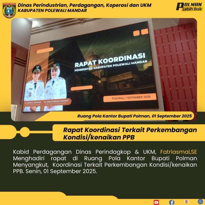 Kabid Perdagangan Dinas Perindagkop & UKM, Fatriasmal,SE Menghadiri rapat di Ruang Pola Kantor Bupati Polman Menyangkut, Koordinasi Terkait Perkembangan Kondisi/kenaikan PPB. Senin, 01 September 2025.