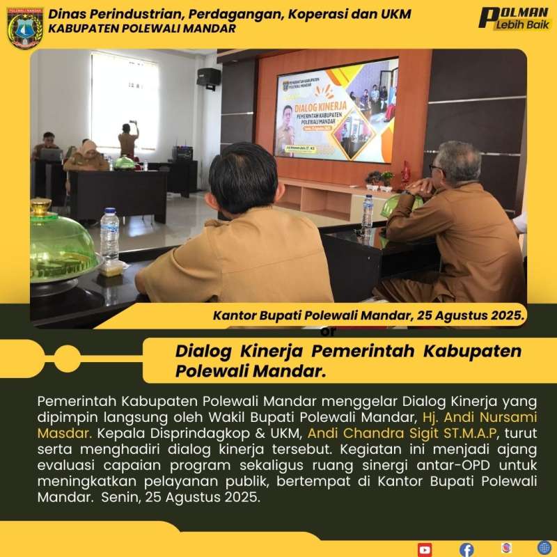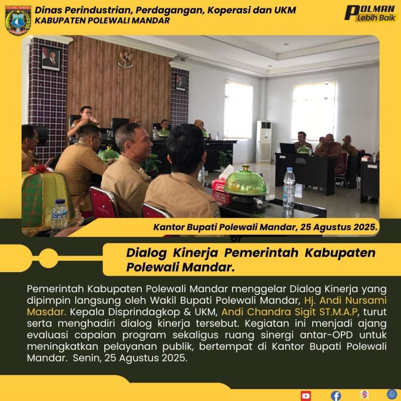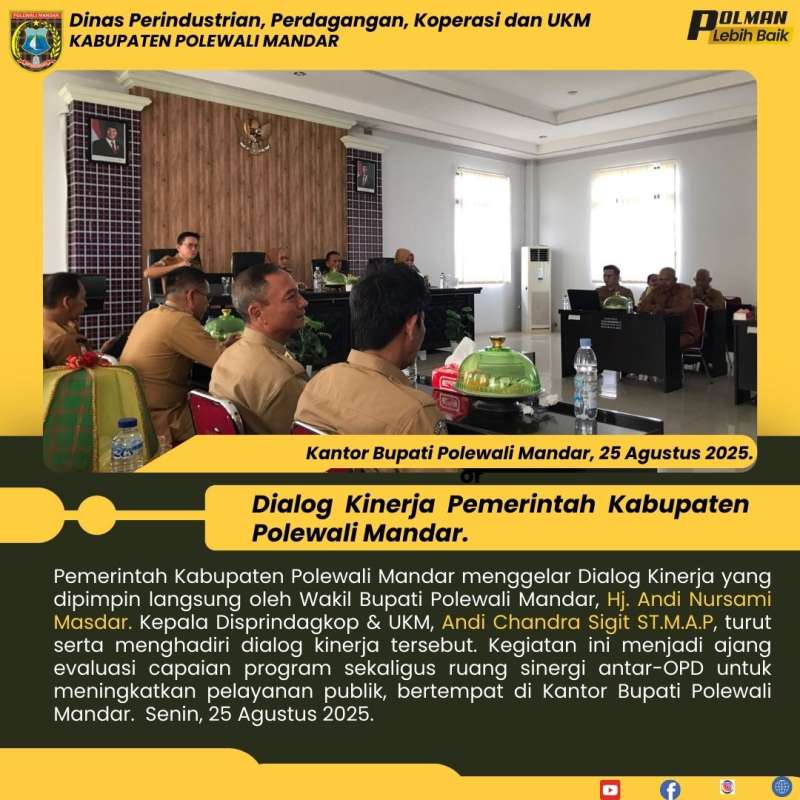 Pemerintah Kabupaten Polewali Mandar menggelar Dialog Kinerja yang dipimpin langsung oleh Wakil Bupati Polewali Mandar, Hj. Andi Nursami Masdar. Kepala Disprindagkop & UKM, Andi Chandra Sigit ST.M.A.P, turut serta menghadiri dialog kinerja tersebut. Kegiatan ini menjadi ajang evaluasi capaian program sekaligus ruang sinergi antar-OPD untuk meningkatkan pelayanan publik, bertempat di Kantor Bupati Polewali Mandar. Senin, 25 Agustus 2025.