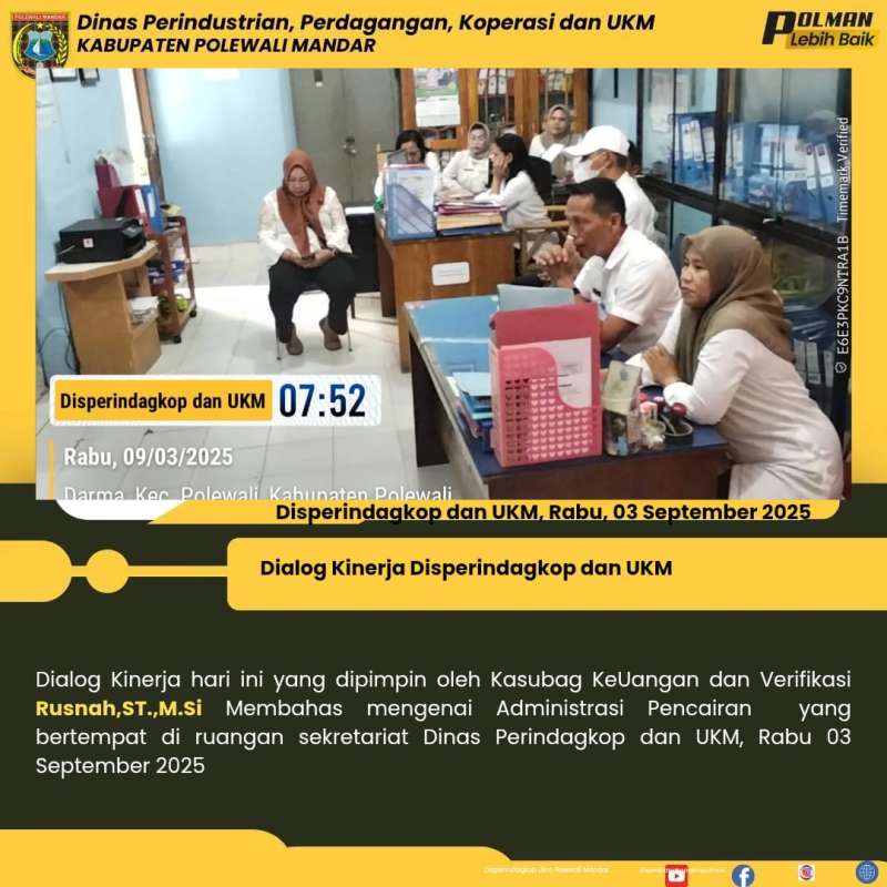 Dialog Kinerja hari ini yang diPimpin oleh Kasubag keUangan dan Verifikasi Rusnha,ST.,M.Si Membahas Mengenai Administrasi Pencairan yang bertempat di Ruangan Sekretariat Dinas Perindagkop dan UKM, Rabu 03 September 2025