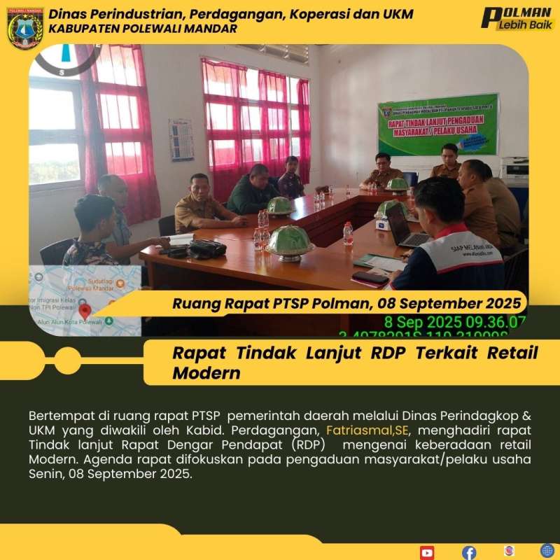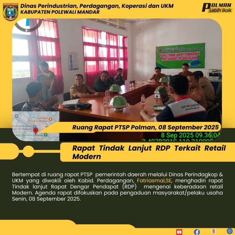 Bertempat di ruang rapat PTSP pemerintah daerah melalui Dinas Perindagkop & UKM yang diwakili oleh Kabid. Perdagangan, Fatriasmal,SE, menghadiri rapat Tindak lanjut Rapat Dengar Pendapat (RDP) mengenai keberadaan retail Modern. Agenda rapat difokuskan pada pengaduan masyarakat/pelaku usaha Senin, 08 September 2025.