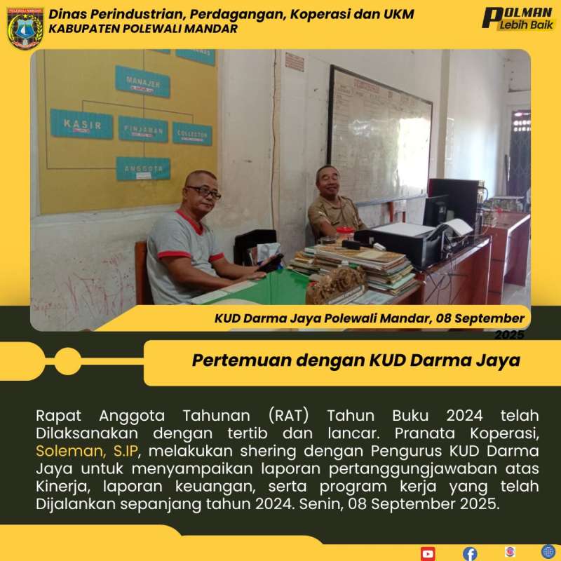 Rapat Anggota Tahunan (RAT) Tahun Buku 2024 telah Dilaksanakan dengan tertib dan lancar. Pranata Koperasi, Soleman, S.IP, melakukan shering dengan Pengurus KUD Darma Jaya untuk menyampaikan laporan pertanggungjawaban atas Kinerja, laporan keuangan, serta program kerja yang telah Dijalankan sepanjang tahun 2024. Senin, 08 September 2025.