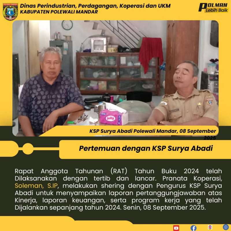 Rapat Anggota Tahunan (RAT) Tahun Buku 2024 telah Dilaksanakan dengan tertib dan lancar. Pranata Koperasi, Soleman, S.IP, melakukan shering dengan Pengurus KSP Surya Abadi untuk menyampaikan laporan pertanggungjawaban atas Kinerja, laporan keuangan, serta program kerja yang telah Dijalankan sepanjang tahun 2024. Senin, 08 September 2025.
