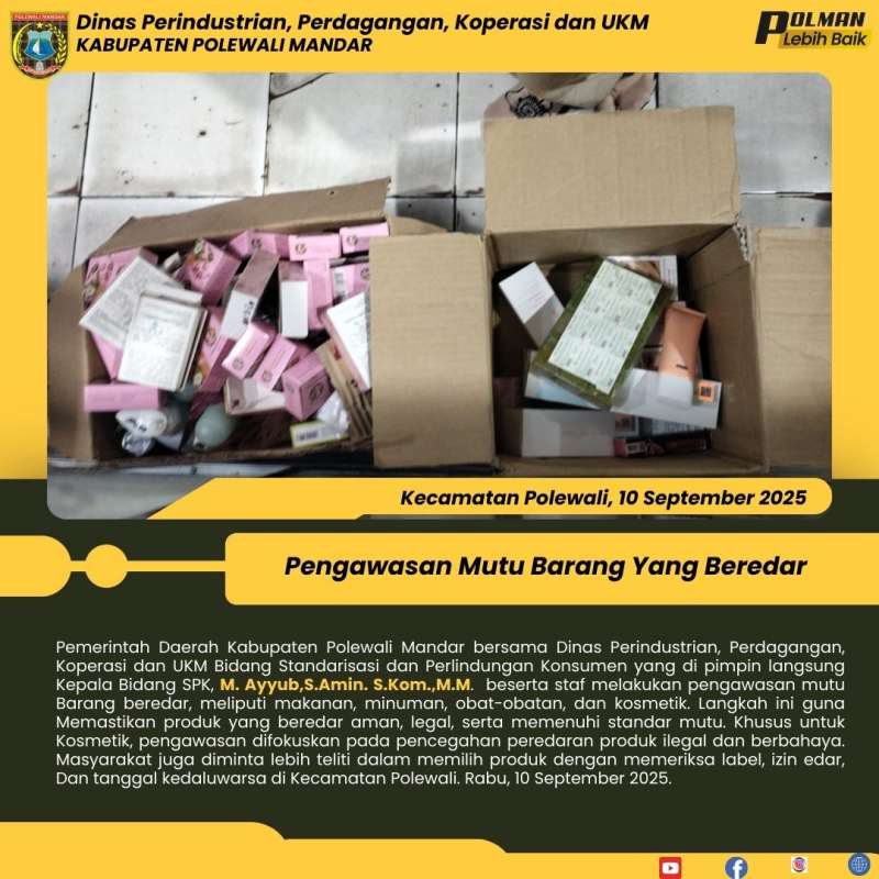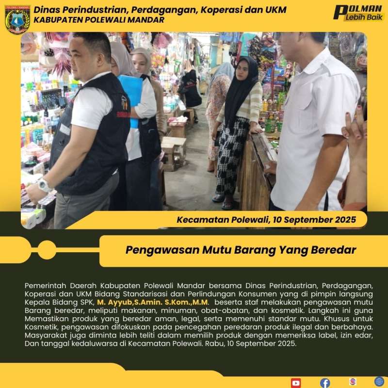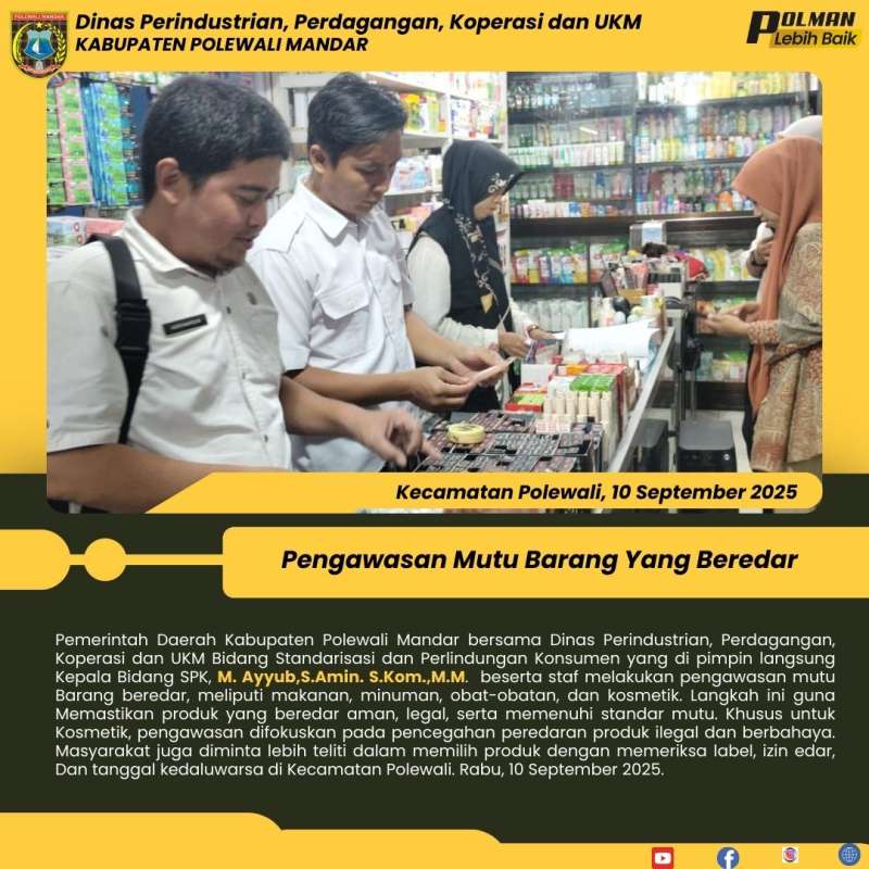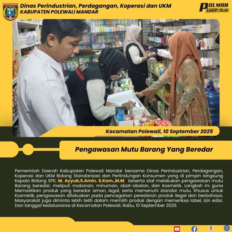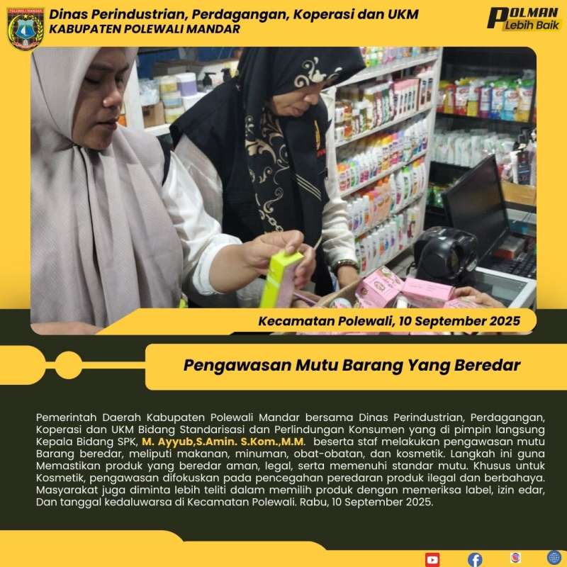Pemerintah Daerah Kabupaten Polewali Mandar bersama Dinas Perindustrian, Perdagangan, Koperasi dan UKM Bidang Standarisasi dan Perlindungan Konsumen yang di pimpin langsung Kepala Bidang SPK, M. Ayyub,S.Amin. S.Kom.,M.M. beserta staf melakukan pengawasan mutu Barang beredar, meliputi makanan, minuman, obat-obatan, dan kosmetik. Langkah ini guna Memastikan produk yang beredar aman, legal, serta memenuhi standar mutu. Khusus untuk Kosmetik, pengawasan difokuskan pada pencegahan peredaran produk ilegal dan berbahaya. Masyarakat juga diminta lebih teliti dalam memilih produk dengan memeriksa label, izin edar, Dan tanggal kedaluwarsa di Kecamatan Polewali. Rabu, 10 September 2025.