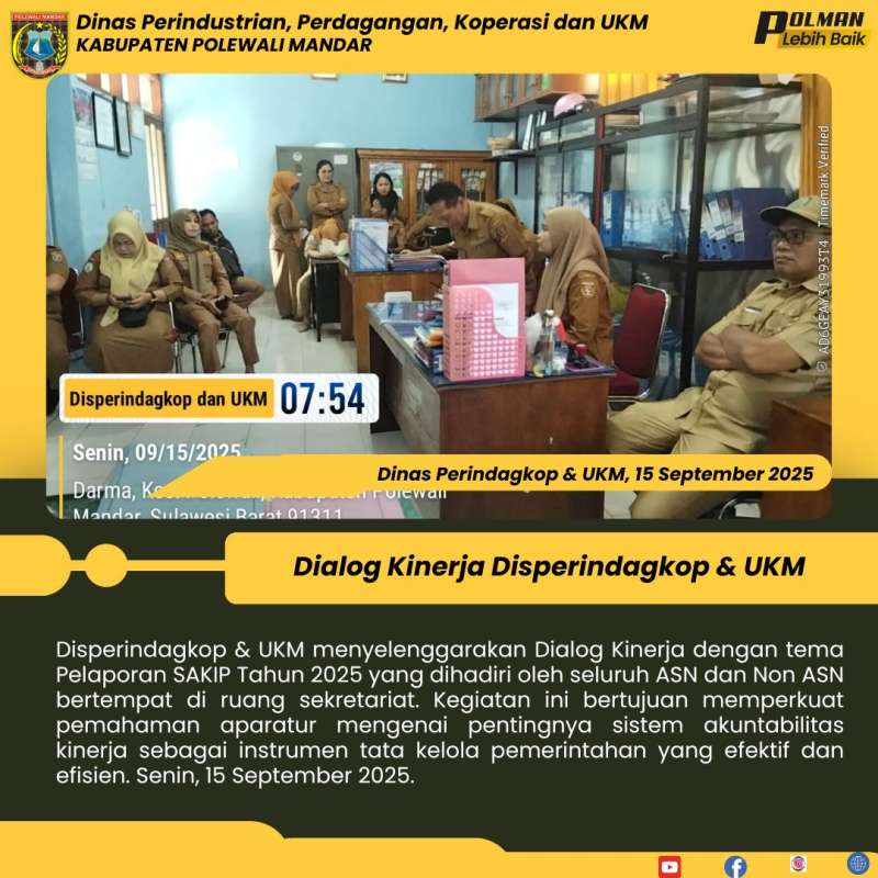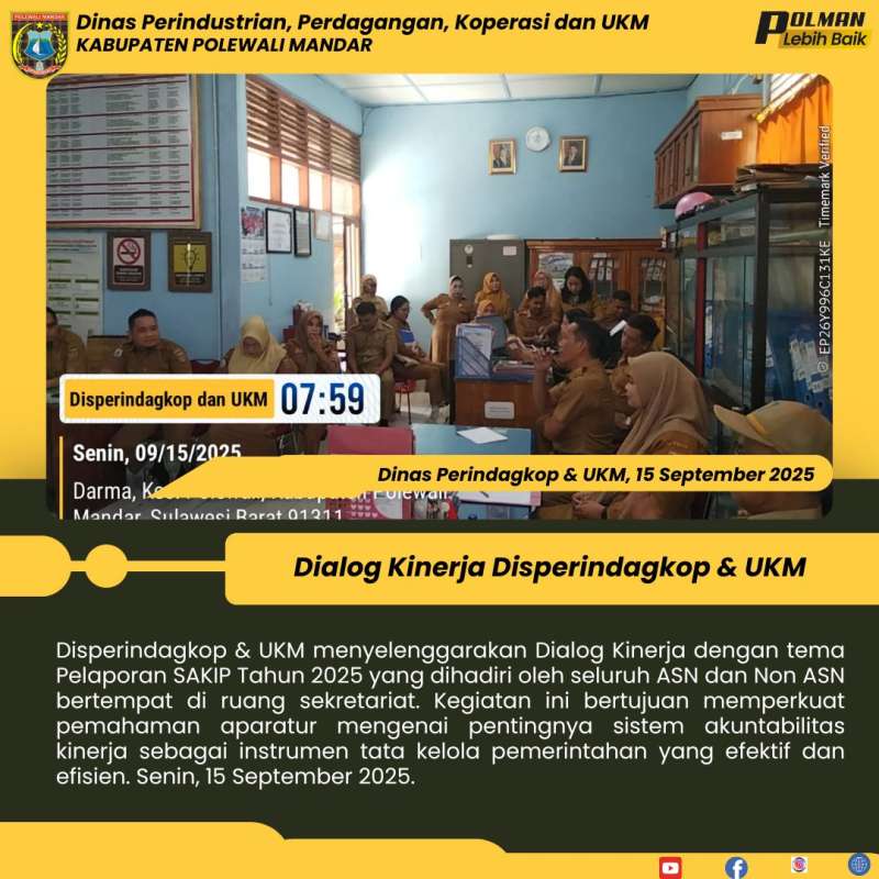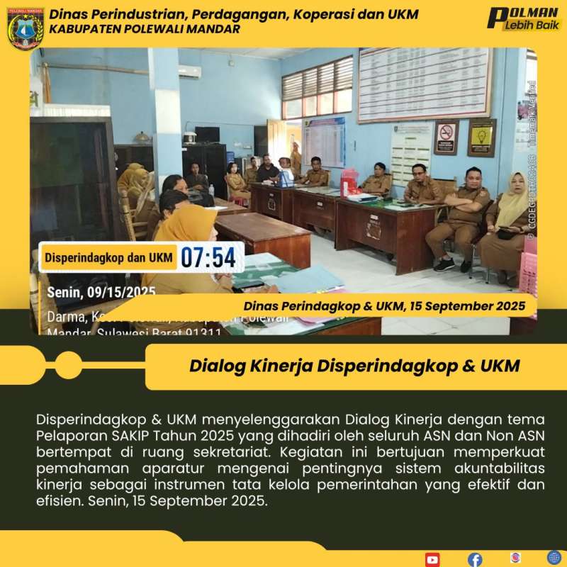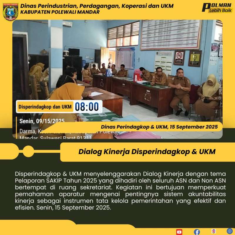 Disperindagkop & UKM menyelenggarakan Dialog Kinerja dengan tema Pelaporan SAKIP Tahun 2025 yang dihadiri oleh seluruh ASN dan Non ASN bertempat di ruang sekretariat. Kegiatan ini bertujuan memperkuat pemahaman aparatur mengenai pentingnya sistem akuntabilitas kinerja sebagai instrumen tata kelola pemerintahan yang efektif dan efisien. Senin, 15 September 2025.