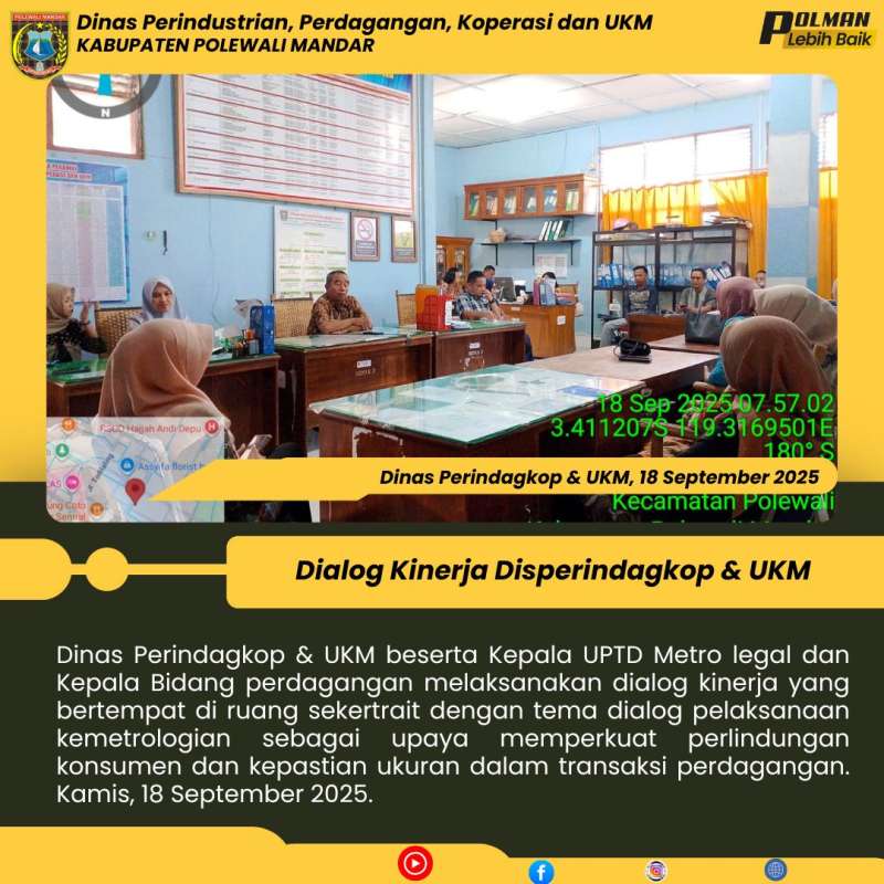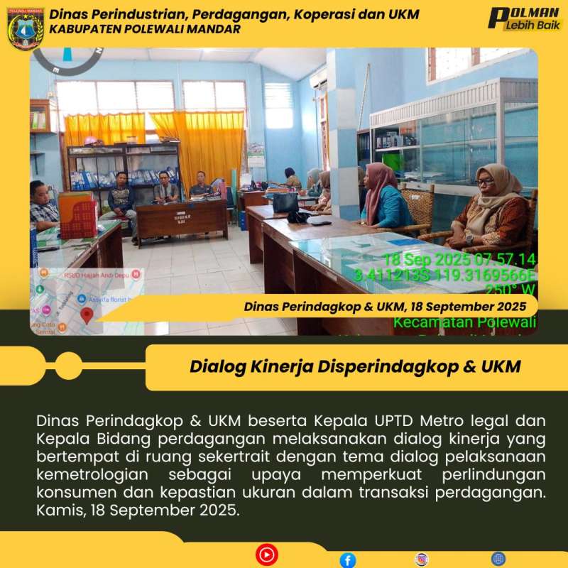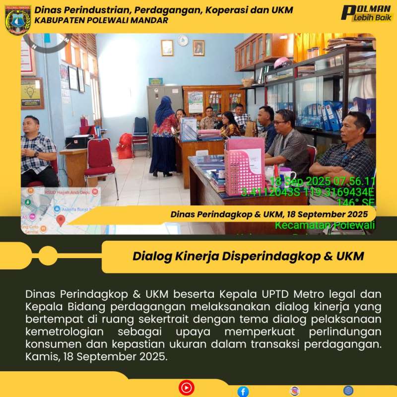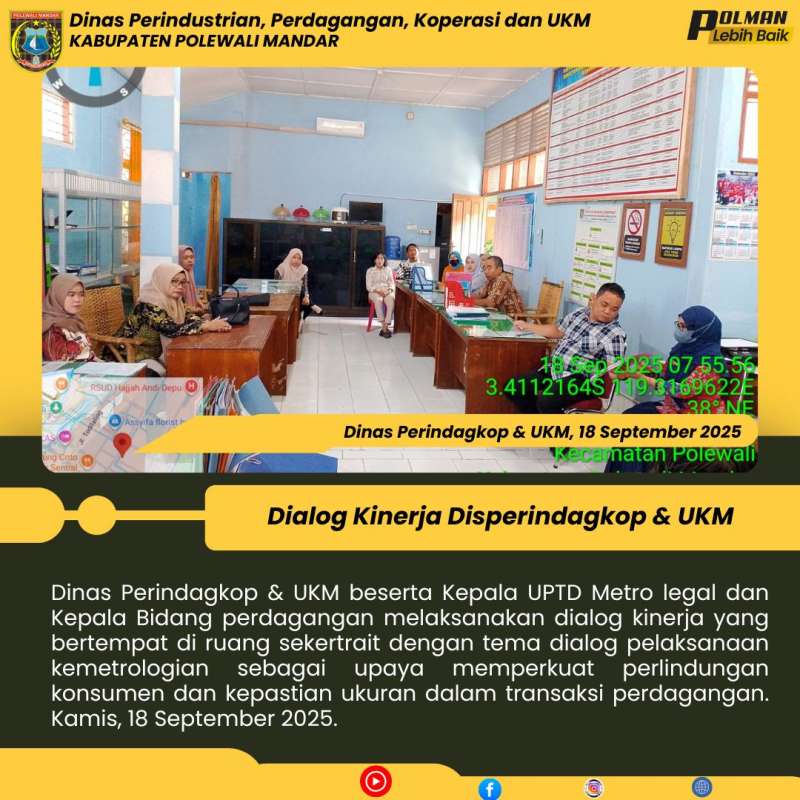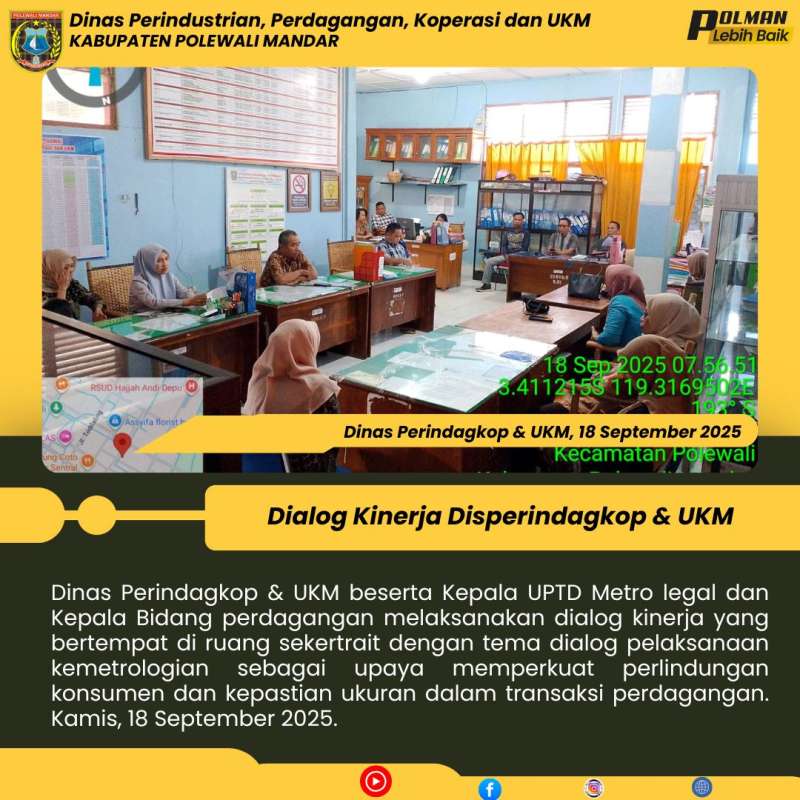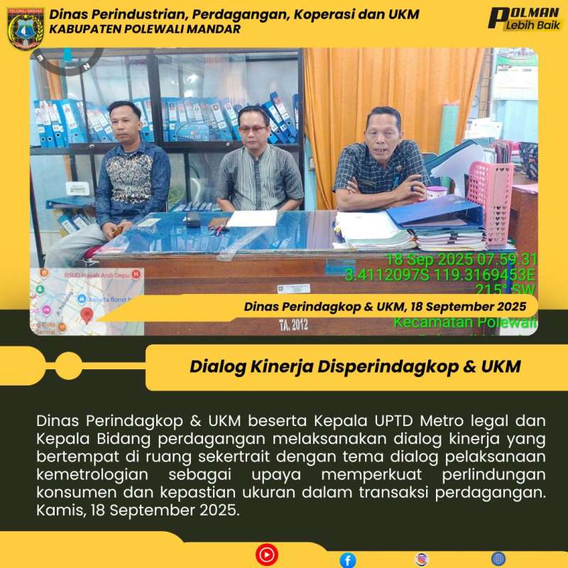 Dinas Perindagkop & UKM beserta Kepala UPTD Metro legal dan Kepala Bidang perdagangan melaksanakan dialog kinerja yang bertempat di ruang sekertrait dengan tema dialog pelaksanaan kemetrologian sebagai upaya memperkuat perlindungan konsumen dan kepastian ukuran dalam transaksi perdagangan. Kamis, 18 September 2025.