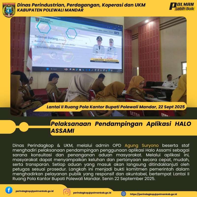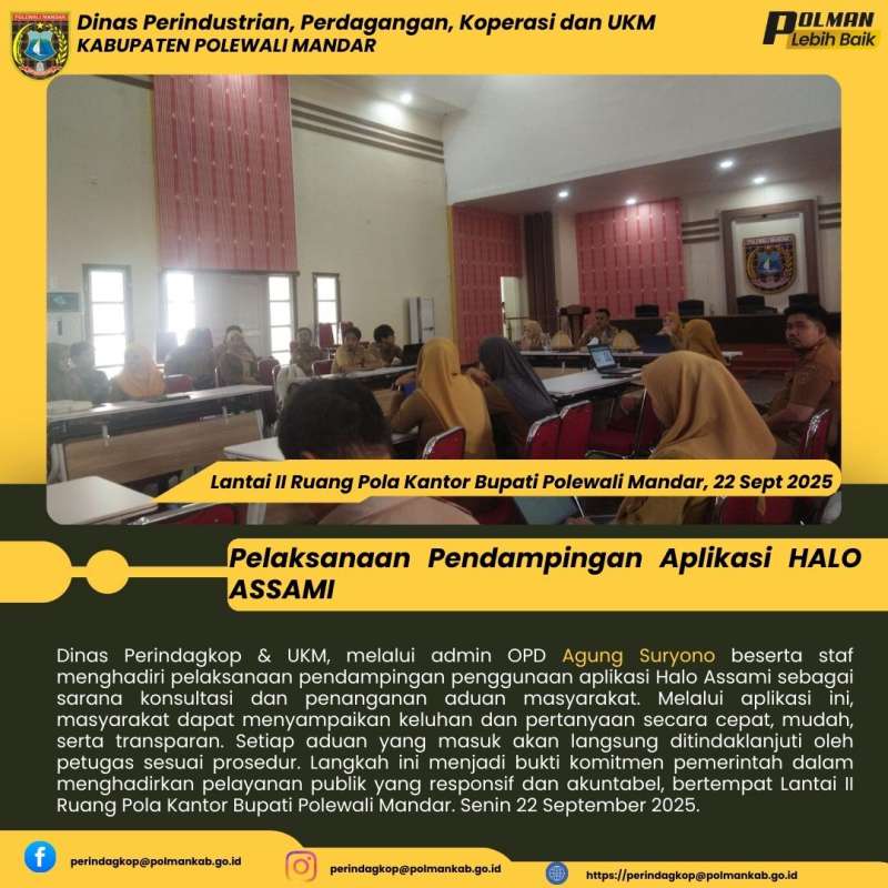 Dinas Perindagkop & UKM, melalui admin OPD Agung Suryono beserta staf menghadiri pelaksanaan pendampingan penggunaan aplikasi Halo Assami sebagai sarana konsultasi dan penanganan aduan masyarakat. Melalui aplikasi ini, masyarakat dapat menyampaikan keluhan dan pertanyaan secara cepat, mudah, serta transparan. Setiap aduan yang masuk akan langsung ditindaklanjuti oleh petugas sesuai prosedur. Langkah ini menjadi bukti komitmen pemerintah dalam menghadirkan pelayanan publik yang responsif dan akuntabel, bertempat Lantai II Ruang Pola Kantor Bupati Polewali Mandar. Senin 22 September 2025.