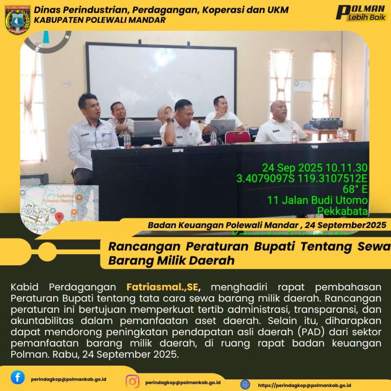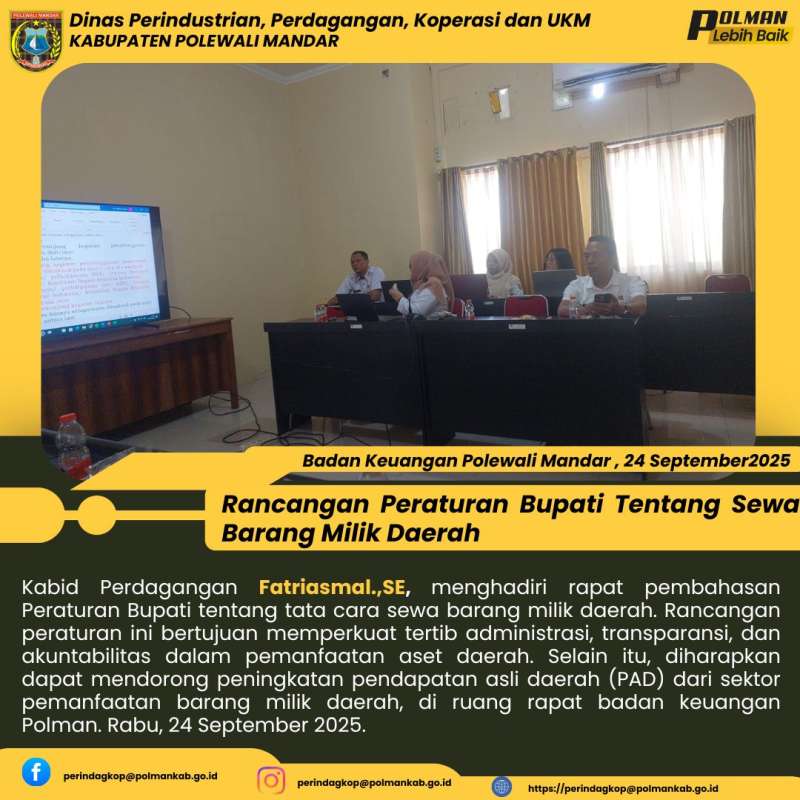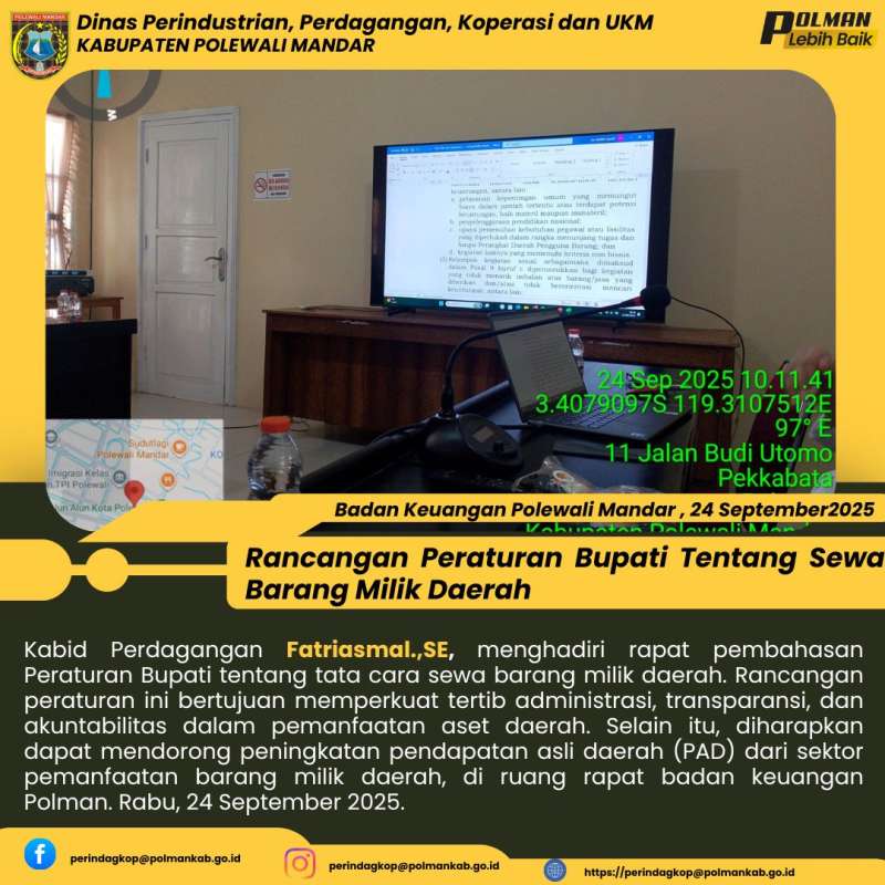 Kabid Perdagangan Fatriasmal.,SE, menghadiri rapat pembahasan Peraturan Bupati tentang tata cara sewa barang milik daerah. Rancangan peraturan ini bertujuan memperkuat tertib administrasi, transparansi, dan akuntabilitas dalam pemanfaatan aset daerah. Selain itu, diharapkan dapat mendorong peningkatan pendapatan asli daerah (PAD) dari sektor pemanfaatan barang milik daerah, di ruang rapat badan keuangan Polman. Rabu, 24 September 2025.