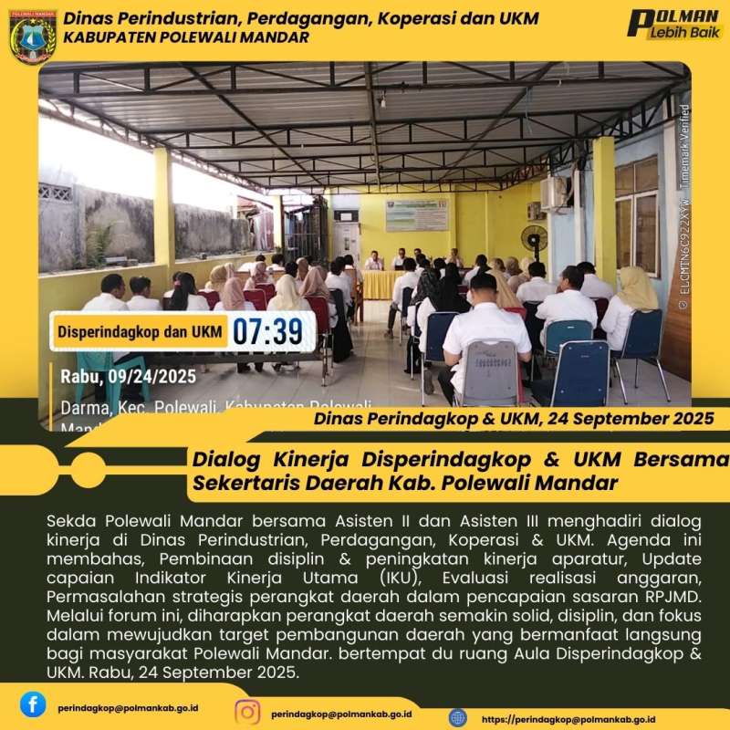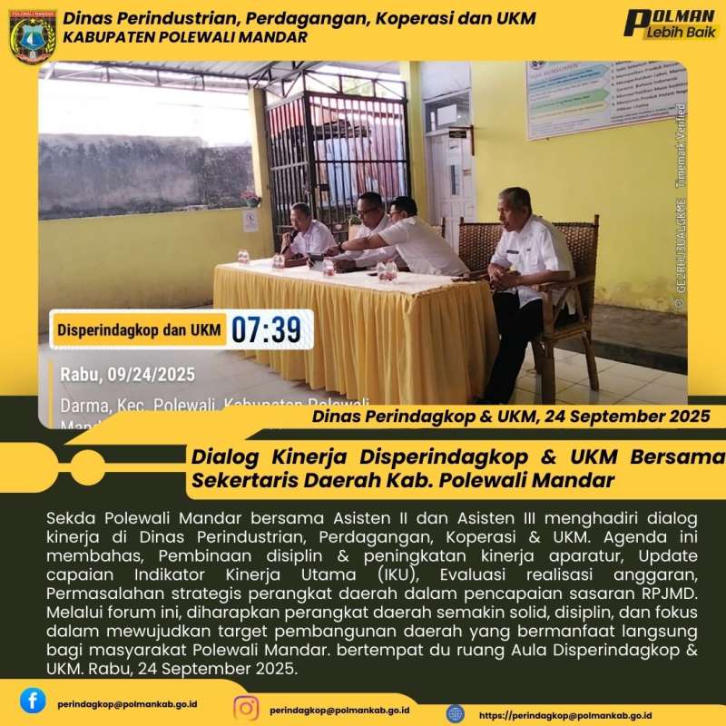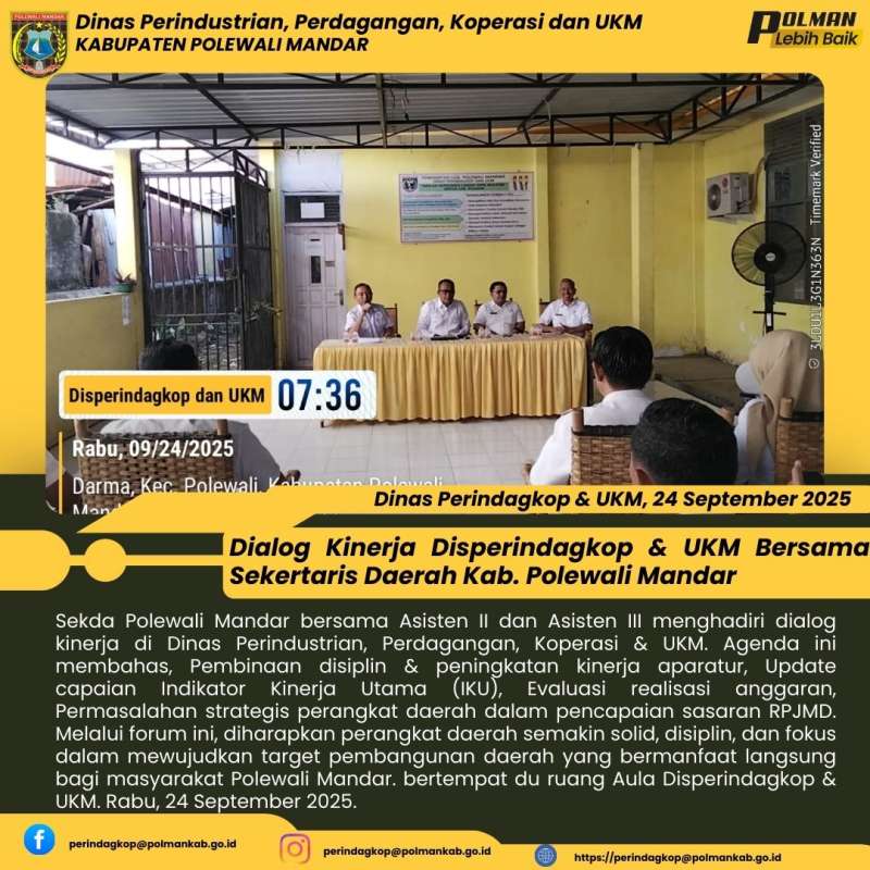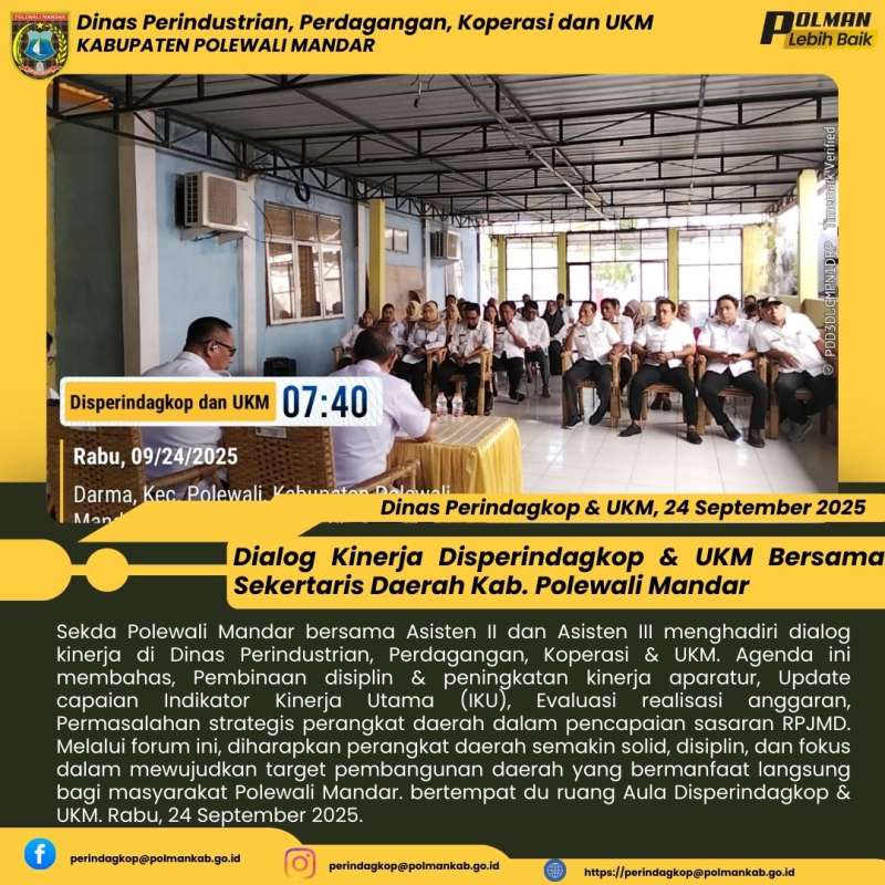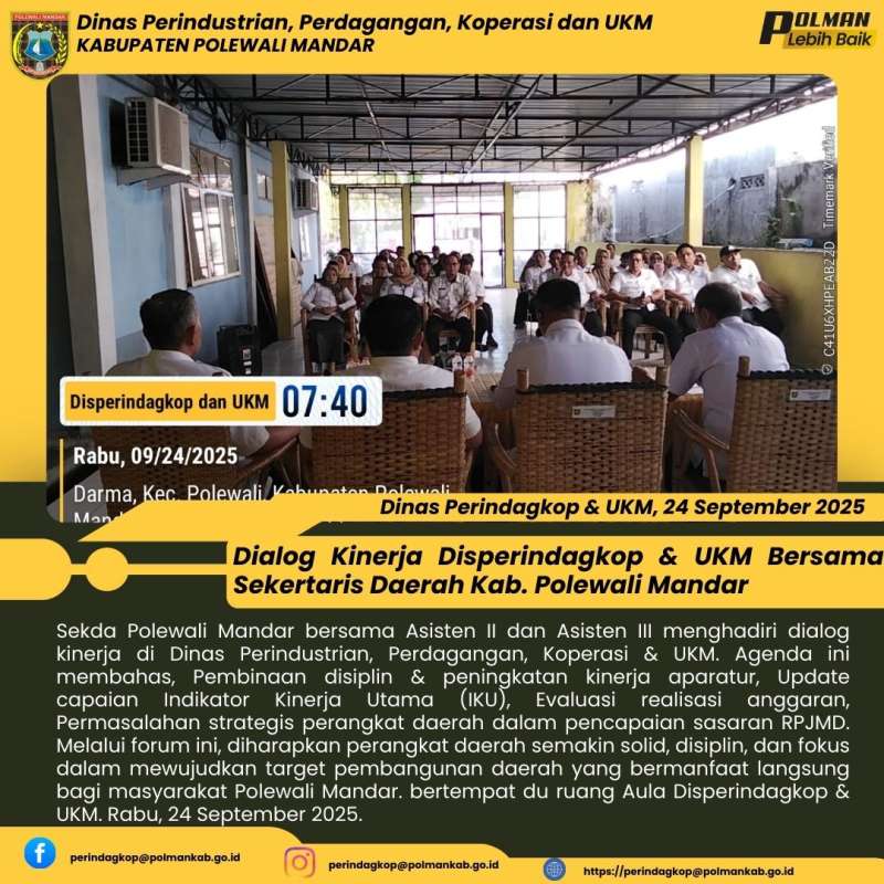 Sekda Polewali Mandar bersama Asisten II dan Asisten III menghadiri dialog kinerja di Dinas Perindustrian, Perdagangan, Koperasi & UKM. Agenda ini membahas, Pembinaan disiplin & peningkatan kinerja aparatur, Update capaian Indikator Kinerja Utama (IKU), Evaluasi realisasi anggaran, Permasalahan strategis perangkat daerah dalam pencapaian sasaran RPJMD. Melalui forum ini, diharapkan perangkat daerah semakin solid, disiplin, dan fokus dalam mewujudkan target pembangunan daerah yang bermanfaat langsung bagi masyarakat Polewali Mandar. bertempat du ruang Aula Disperindagkop & UKM. Rabu, 24 September 2025.