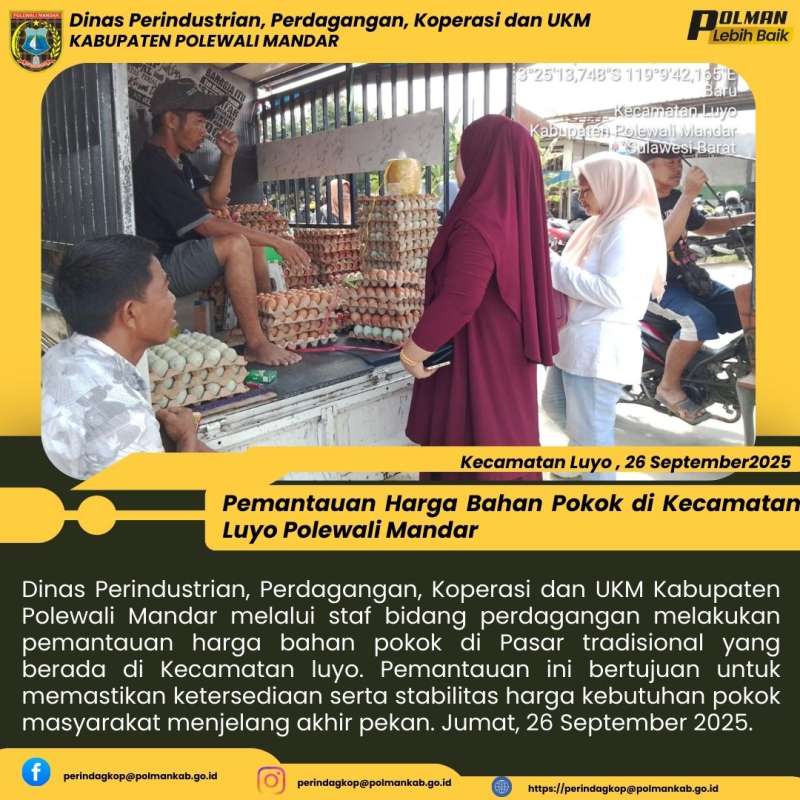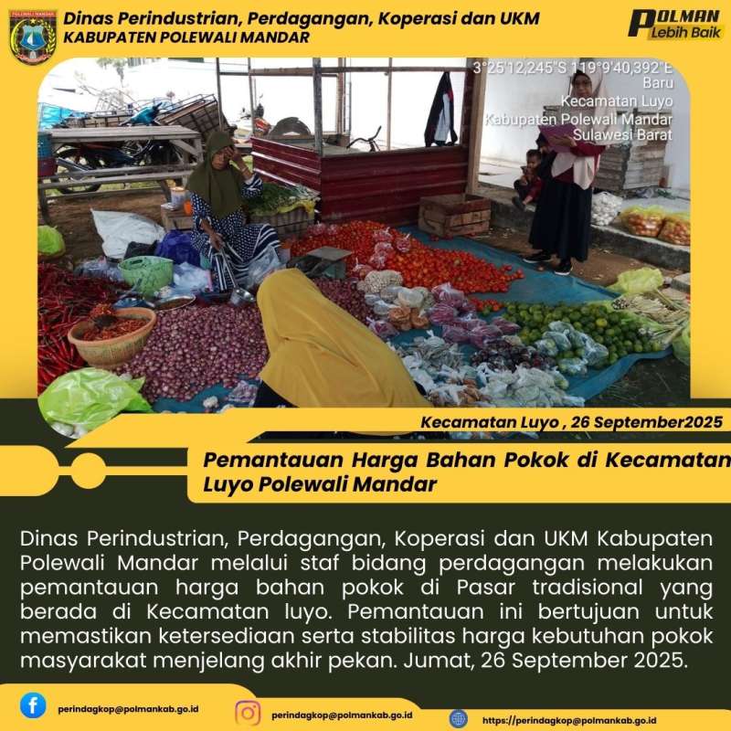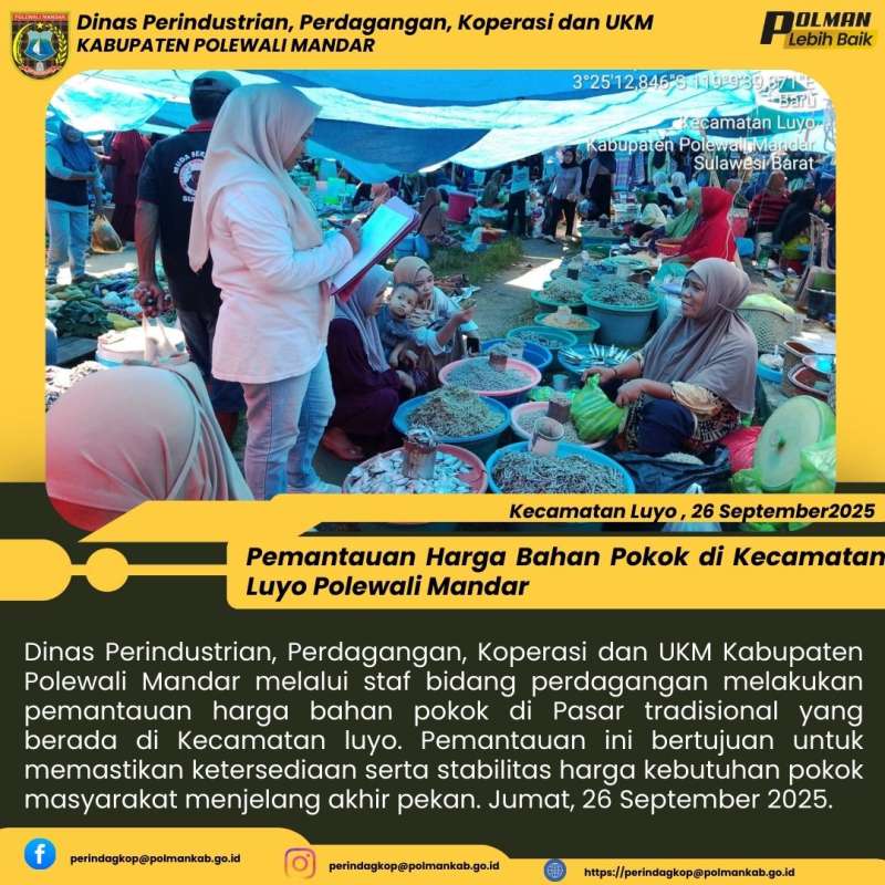Dinas Perindustrian, Perdagangan, Koperasi dan UKM Kabupaten Polewali Mandar melalui staf bidang perdagangan melakukan pemantauan harga bahan pokok di Pasar tradisional yang berada di Kecamatan luyo. Pemantauan ini bertujuan untuk memastikan ketersediaan serta stabilitas harga kebutuhan pokok masyarakat menjelang akhir pekan. Jumat, 26 September 2025.