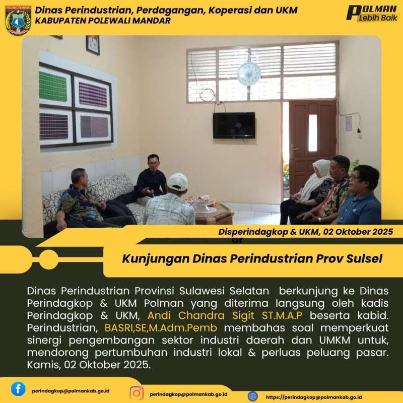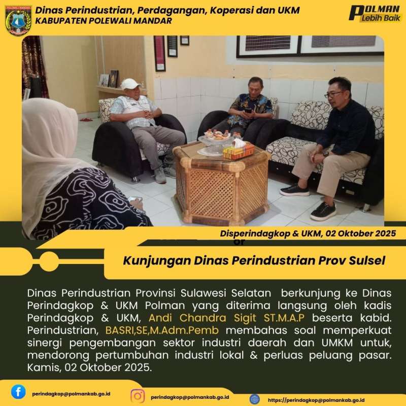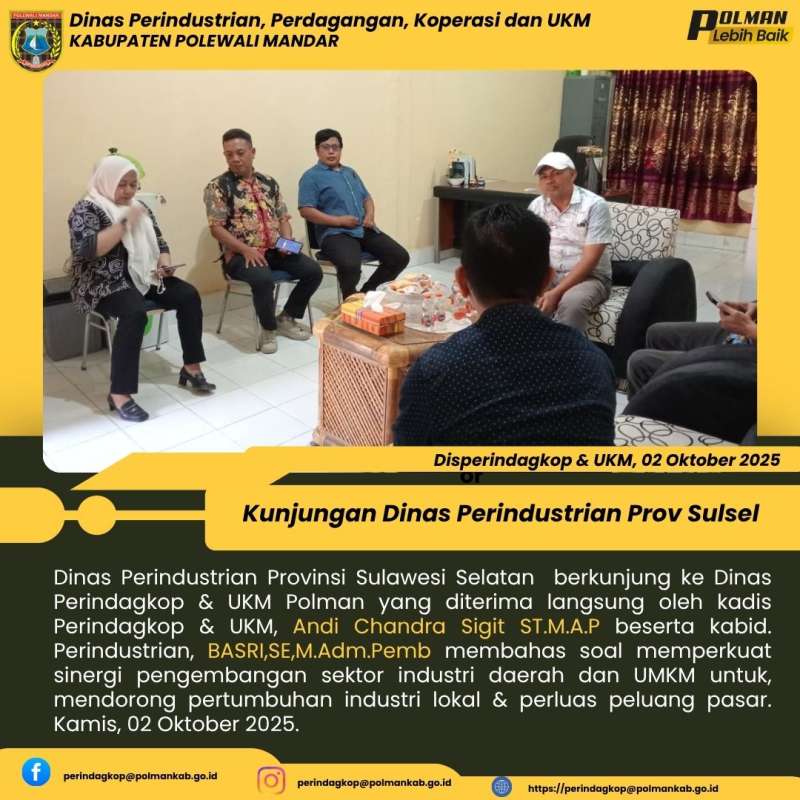 Dinas Perindustrian Provinsi Sulawesi Selatan berkunjung ke Dinas Perindagkop & UKM Polman yang diterima langsung oleh kadis Perindagkop & UKM, Andi Chandra Sigit ST.M.A.P beserta kabid. Perindustrian, BASRI,SE,M.Adm.Pemb membahas soal memperkuat sinergi pengembangan sektor industri daerah dan UMKM untuk, mendorong pertumbuhan industri lokal & perluas peluang pasar. Kamis, 02 Oktober 2025.