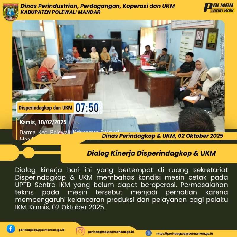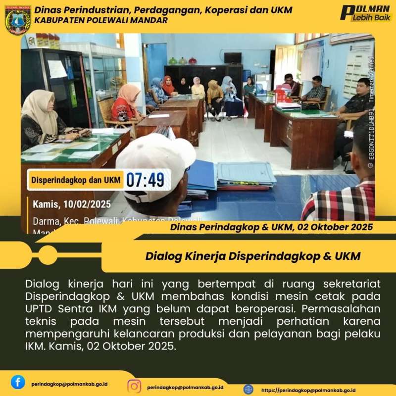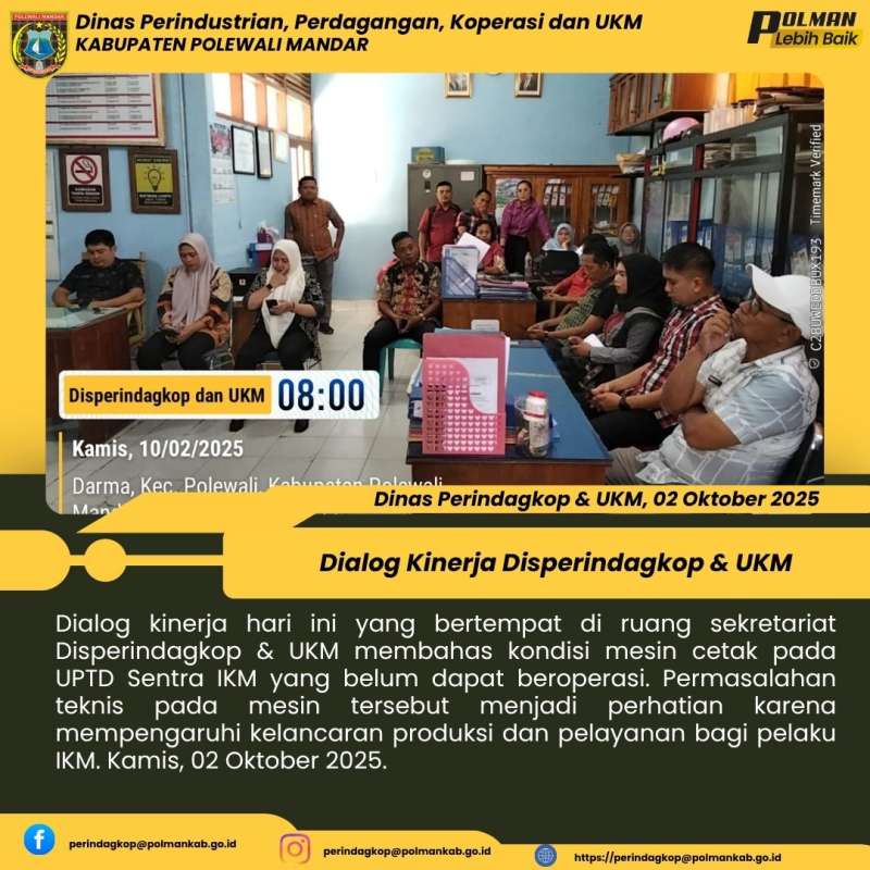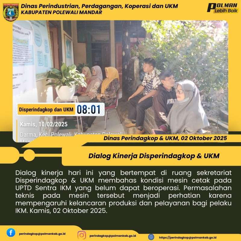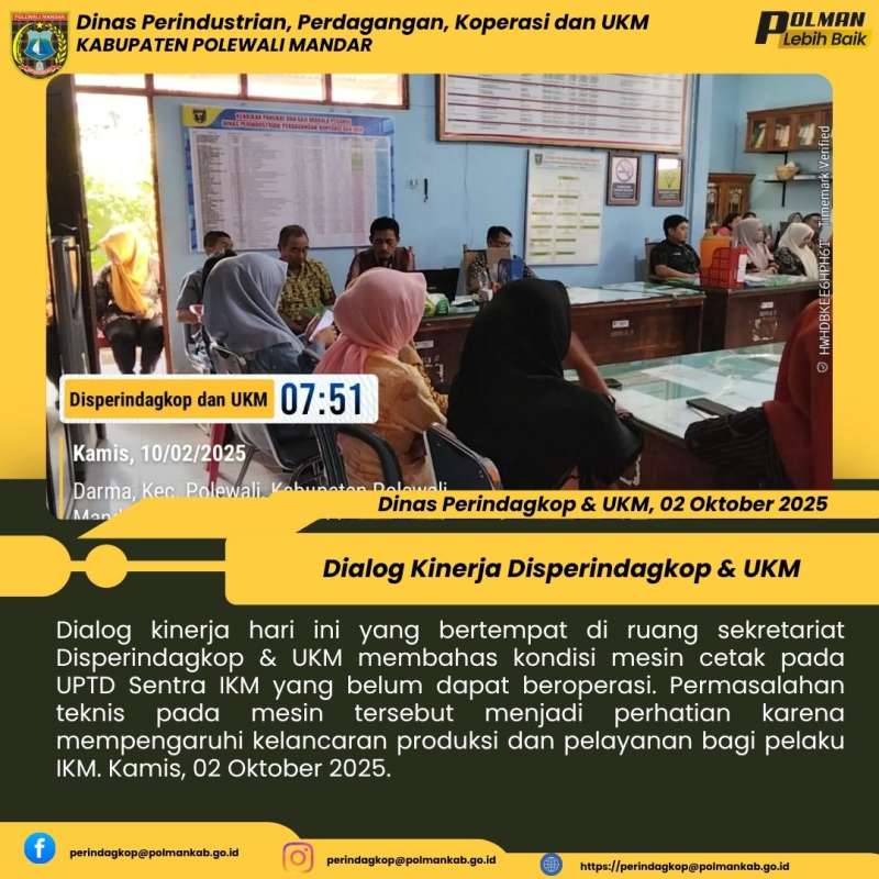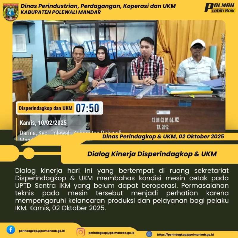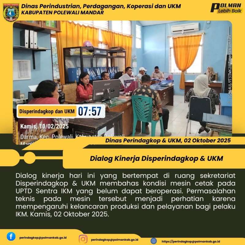 Dialog kinerja hari ini yang bertempat di ruang sekretariat Disperindagkop & UKM membahas kondisi mesin cetak pada UPTD Sentra IKM yang belum dapat beroperasi. Permasalahan teknis pada mesin tersebut menjadi perhatian karena mempengaruhi kelancaran produksi dan pelayanan bagi pelaku IKM. Kamis, 02 Oktober 2025.