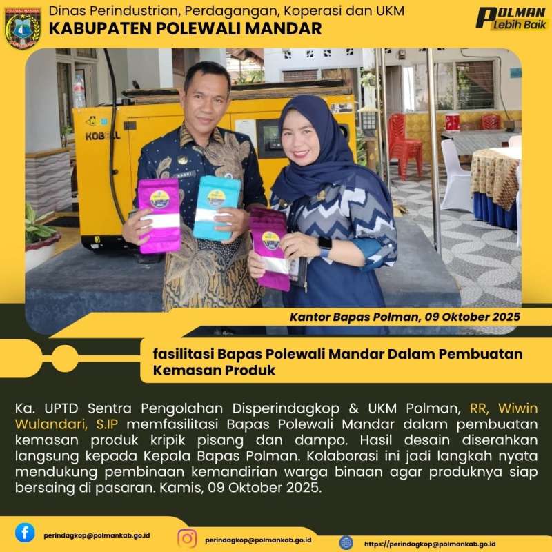 Ka. UPTD Sentra Pengolahan Disperindagkop & UKM Polman, RR, Wiwin Wulandari, S.IP memfasilitasi Bapas Polewali Mandar dalam pembuatan kemasan produk kripik pisang dan dampo. Hasil desain diserahkan langsung kepada Kepala Bapas Polman. Kolaborasi ini jadi langkah nyata mendukung pembinaan kemandirian warga binaan agar produknya siap bersaing di pasaran. Kamis, 09 Oktober 2025.