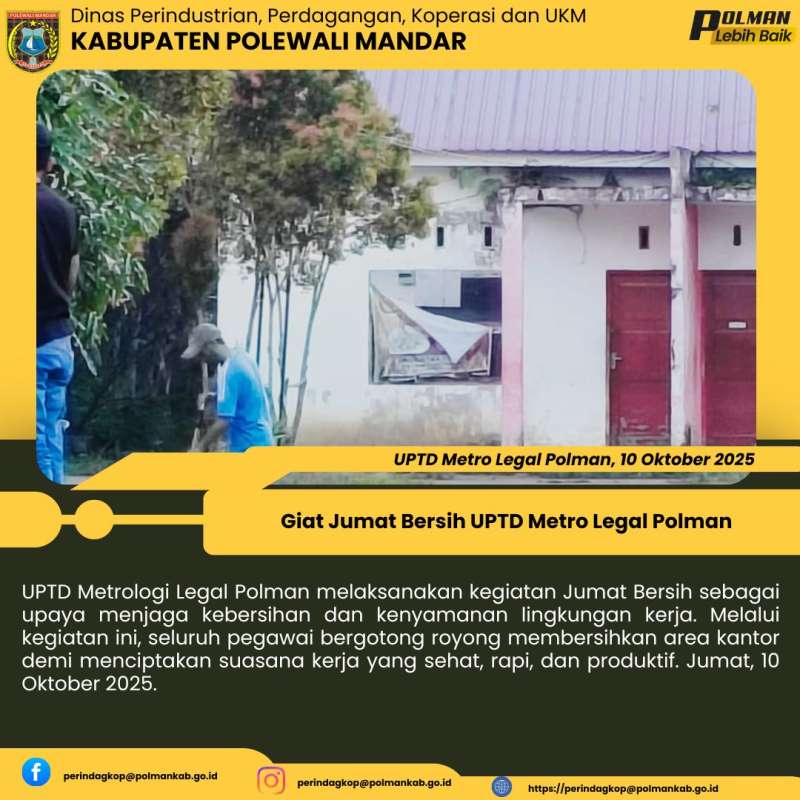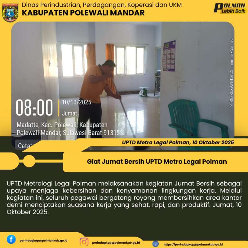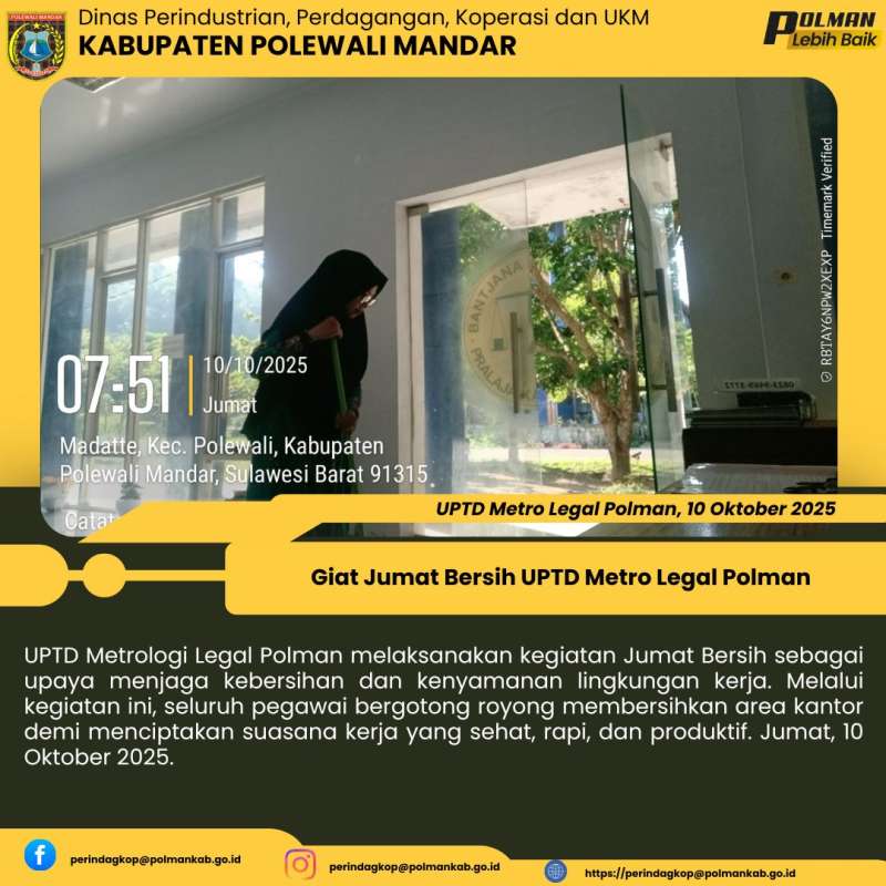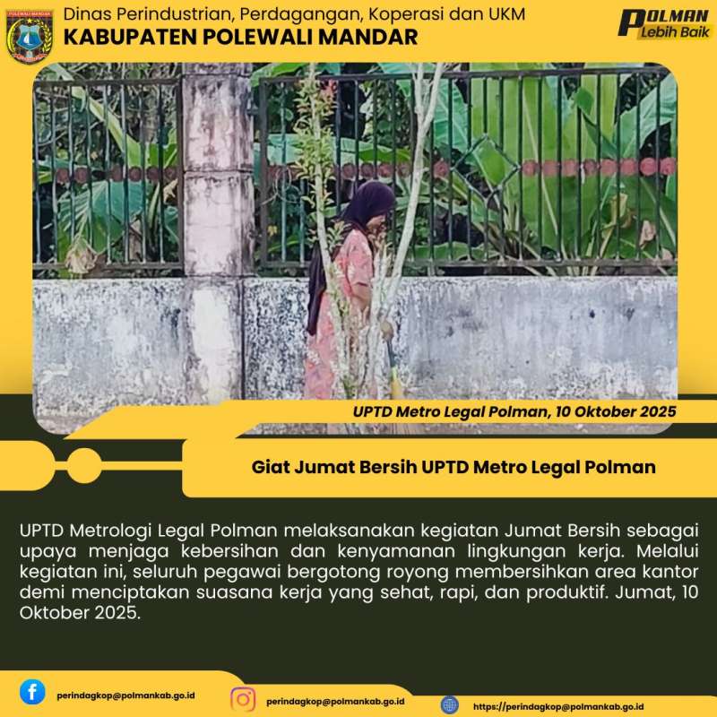 UPTD Metrologi Legal Polman melaksanakan kegiatan Jumat Bersih sebagai upaya menjaga kebersihan dan kenyamanan lingkungan kerja. Melalui kegiatan ini, seluruh pegawai bergotong royong membersihkan area kantor demi menciptakan suasana kerja yang sehat, rapi, dan produktif. Jumat, 10 Oktober 2025.