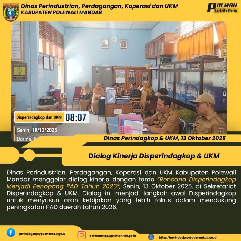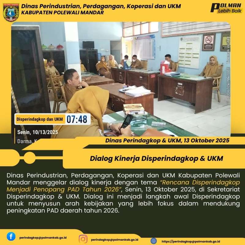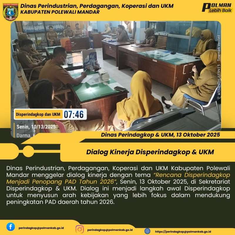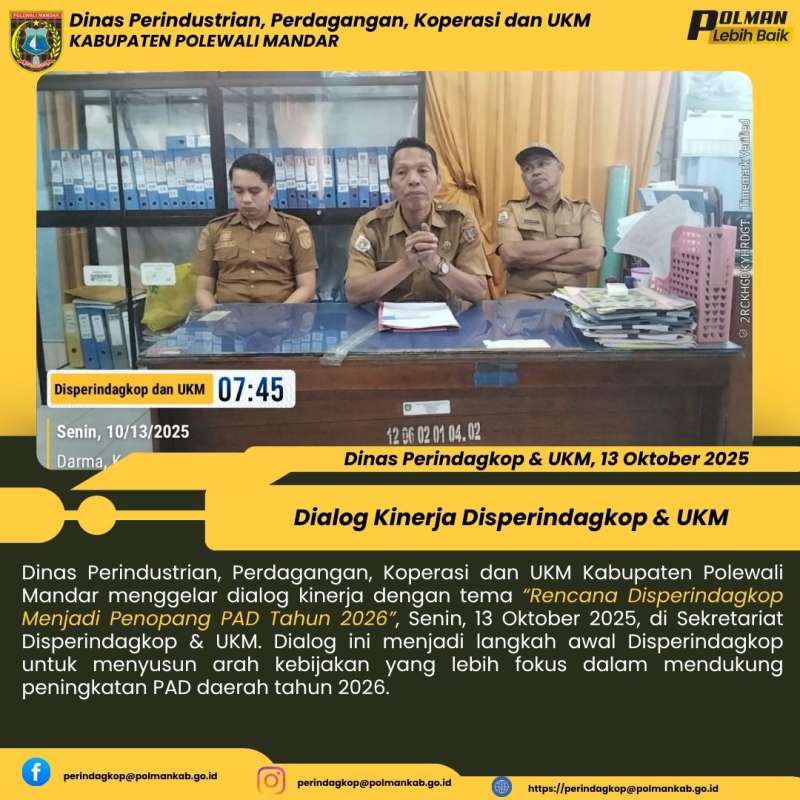Dinas Perindustrian, Perdagangan, Koperasi dan UKM Kabupaten Polewali Mandar menggelar dialog kinerja dengan tema “Rencana Disperindagkop Menjadi Penopang PAD Tahun 2026”, Senin, 13 Oktober 2025, di Sekretariat Disperindagkop & UKM. Dialog ini menjadi langkah awal Disperindagkop untuk menyusun arah kebijakan yang lebih fokus dalam mendukung peningkatan PAD daerah tahun 2026.