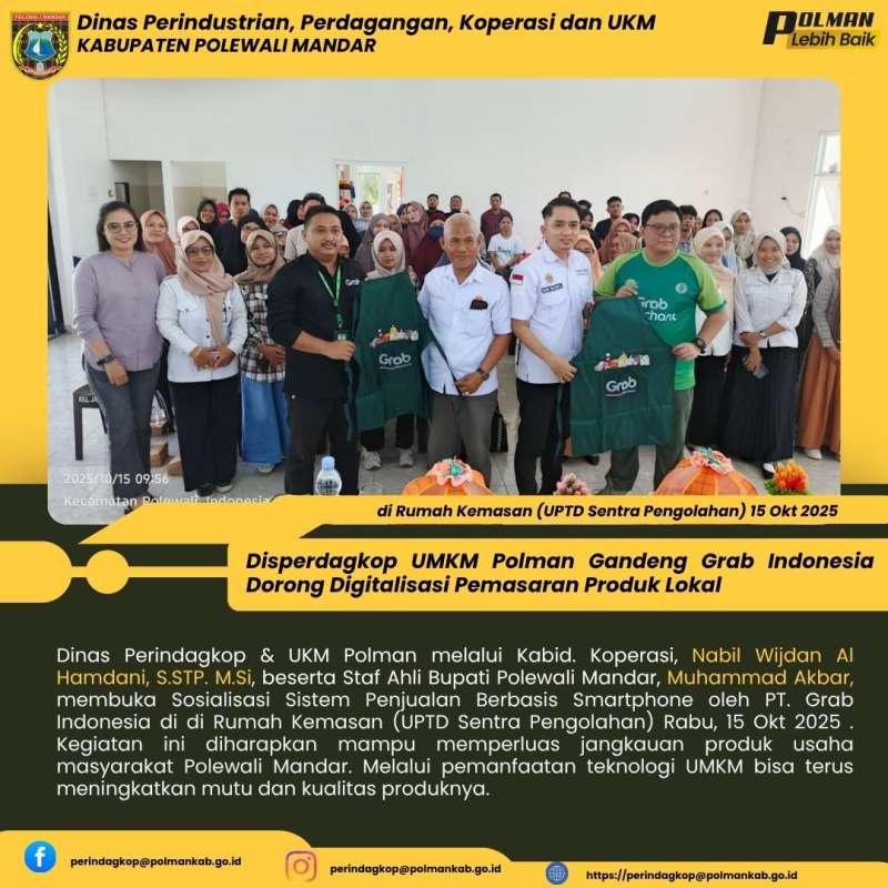 Dinas Perindagkop & UKM Polman melalui Kabid. Koperasi, Nabil Wijdan Al Hamdani, S.STP. M.Si, beserta Staf Ahli Bupati Polewali Mandar, Muhammad Akbar, membuka Sosialisasi Sistem Penjualan Berbasis Smartphone oleh PT. Grab Indonesia di di Rumah Kemasan (UPTD Sentra Pengolahan) Rabu, 15 Okt 2025 . Kegiatan ini diharapkan mampu memperluas jangkauan produk usaha masyarakat Polewali Mandar. Melalui pemanfaatan teknologi UMKM bisa terus meningkatkan mutu dan kualitas produknya.